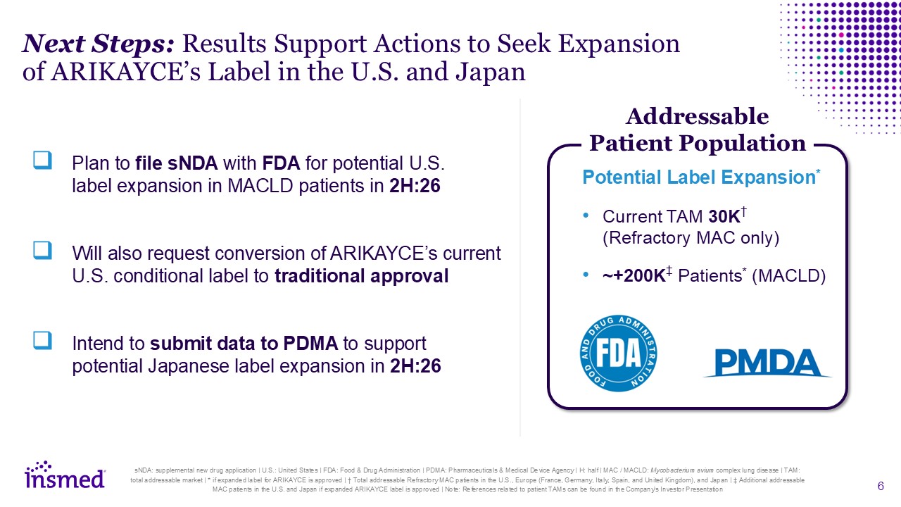 Next Steps: Results Support Actions to Seek Expansion of ARIKAYCE’s Label in the U.S. and Japan   Plan to file sNDA with FDA for potential U.S. label expansion in MACLD patients in 2H:26  Will also request conversion of ARIKAYCE’s current U.S. conditional label to traditional approval  Intend to submit data to PDMA to support potential Japanese label expansion in 2H:26  sNDA: supplemental new drug application | U.S.: United States | FDA: Food & Drug Administration | PDMA: Pharmaceuticals & Medical Device Agency | H: half | MAC / MACLD: Mycobacterium avium complex lung disease | TAM: total addressable market | * if expanded label for ARIKAYCE is approved | † Total addressable Refractory MAC patients in the U.S., Europe (France, Germany, Italy, Spain, and United Kingdom), and Japan | ‡ Additional addressable MAC patients in the U.S. and Japan if expanded ARIKAYCE label is approved | Note: References related to patient TAMs can be found in the Company's Investor Presentation  Potential Label Expansion*  Current TAM 30K† (Refractory MAC only)  ~+200K‡ Patients* (MACLD)  Addressable   Patient Population