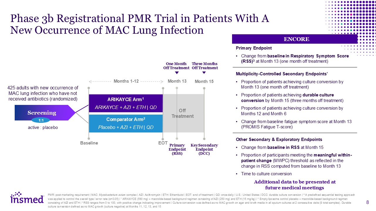 Phase 3b Registrational PMR Trial in Patients With A New Occurrence of MAC Lung Infection  PMR: post-marketing requirement | MAC: Mycobacterium avium complex | AZI: Azithromycin | ETH: Ethambutol | EOT: end of treatment | QD: once-daily | U.S.: United States | DCC: durable culture conversion | * A predefined sequential testing approach was applied to control the overall type I error rate (α=0.05) | 1 ARIKAYCE (590 mg) + macrolide-based background regimen consisting of AZI (250 mg) and ETH (15 mg/kg) | 2 Empty liposome control placebo + macrolide-based background regimen consisting of AZI and ETH | 3 RSS ranges from 0 to 100, with positive change indicating improvement | Culture conversion was defined as no MAC growth on agar and broth media in all sputum cultures at 2 consecutive visits (8 total samples). Durable culture conversion defined as no MAC growth (culture negative) at Months 11, 12, 13, and 15  Key Secondary Endpoint  (DCC)  425 adults with new occurrence of MAC lung infection who have not received antibiotics (randomized)  ARIKAYCE Arm1  ARIKAYCE + AZI + ETH | QD  Comparator Arm2  Placebo + AZI + ETH | QD  Primary   Endpoint  (RSS)  Month 13  Month 15  active : placebo  Screening  1:1  One Month   Off Treatment  Three Months Off Treatment  Off   Treatment  Months 1-12  Baseline  EOT   ENCORE  Primary Endpoint  Change from baseline in Respiratory Symptom Score (RSS)3 at Month 13 (one month off treatment)  Multiplicity-Controlled Secondary Endpoints*  Proportion of patients achieving culture conversion by Month 13 (one month off treatment)  Proportion of patients achieving durable culture conversion by Month 15 (three months off treatment)  Proportion of patients achieving culture conversion by Months 12 and Month 6  Change from baseline fatigue symptom score at Month 13 (PROMIS Fatigue T-score)  Other Secondary & Exploratory Endpoints  Change from baseline in RSS at Month 15  Proportion of participants meeting the meaningful within-patient change (MWPC) threshold as reflected in the change in RSS computed from baseline to Month 13   Time to culture conversion  Additional data to be presented at   future medical meetings