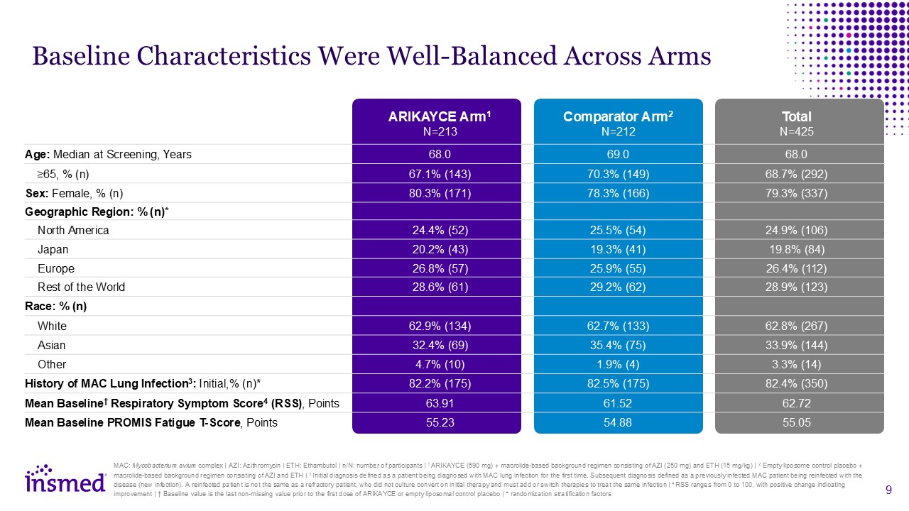 ARIKAYCE Arm1N=213  Comparator Arm2N=212  Total  N=425  Age: Median at Screening, Years  68.0  69.0  68.0  ≥65, % (n)  67.1% (143)  70.3% (149)  68.7% (292)  Sex: Female, % (n)  80.3% (171)  78.3% (166)  79.3% (337)  Geographic Region: % (n)*  North America  24.4% (52)  25.5% (54)  24.9% (106)  Japan  20.2% (43)  19.3% (41)  19.8% (84)  Europe  26.8% (57)  25.9% (55)  26.4% (112)  Rest of the World  28.6% (61)  29.2% (62)  28.9% (123)  Race: % (n)  White  62.9% (134)  62.7% (133)  62.8% (267)  Asian  32.4% (69)  35.4% (75)  33.9% (144)  Other  4.7% (10)  1.9% (4)  3.3% (14)  History of MAC Lung Infection3: Initial,% (n)*  82.2% (175)  82.5% (175)  82.4% (350)  Mean Baseline† Respiratory Symptom Score4 (RSS), Points  63.91  61.52  62.72  Mean Baseline PROMIS Fatigue T-Score, Points  55.23  54.88  55.05  Baseline Characteristics Were Well-Balanced Across Arms  MAC: Mycobacterium avium complex | AZI: Azithromycin | ETH: Ethambutol | n/N: number of participants | 1 ARIKAYCE (590 mg) + macrolide-based background regimen consisting of AZI (250 mg) and ETH (15 mg/kg) | 2 Empty liposome control placebo + macrolide-based background regimen consisting of AZI and ETH | 3 Initial diagnosis defined as a patient being diagnosed with MAC lung infection for the first time. Subsequent diagnosis defined as a previously infected MAC patient being reinfected with the disease (new infection). A reinfected patient is not the same as a refractory patient, who did not culture convert on initial therapy and must add or switch therapies to treat the same infection | 4 RSS ranges from 0 to 100, with positive change indicating improvement | † Baseline value is the last non-missing value prior to the first dose of ARIKAYCE or empty liposomal control placebo | * randomization stratification factors