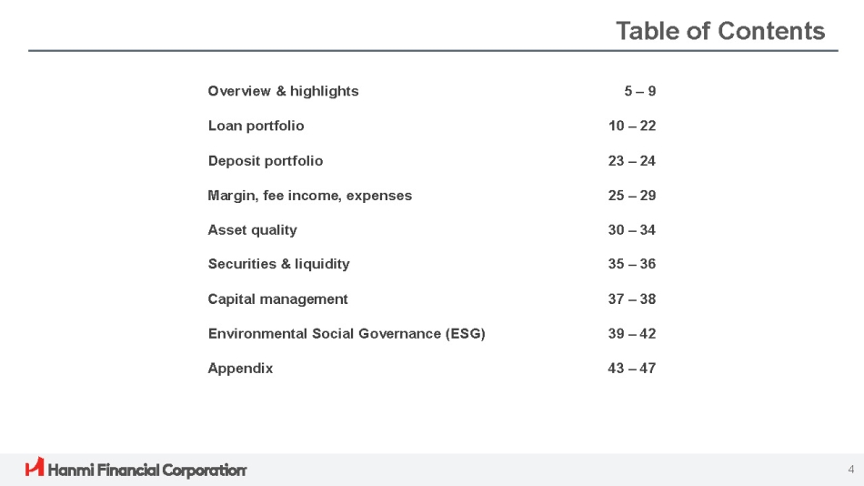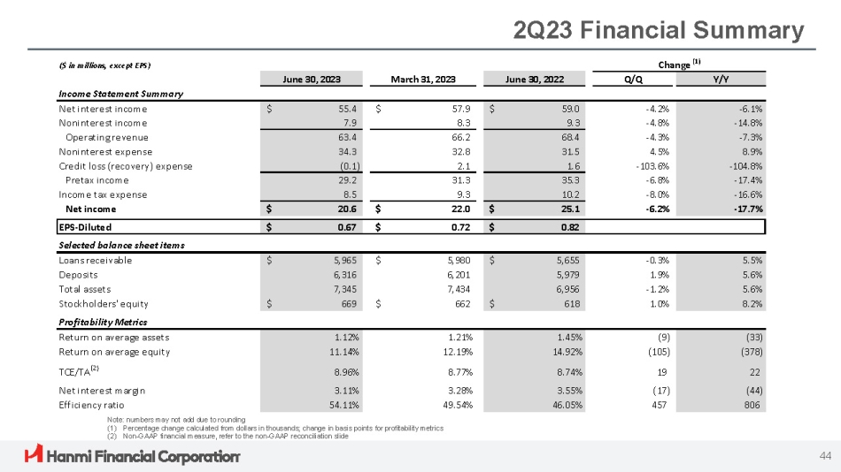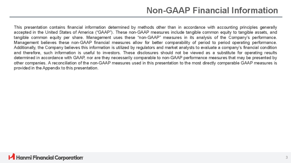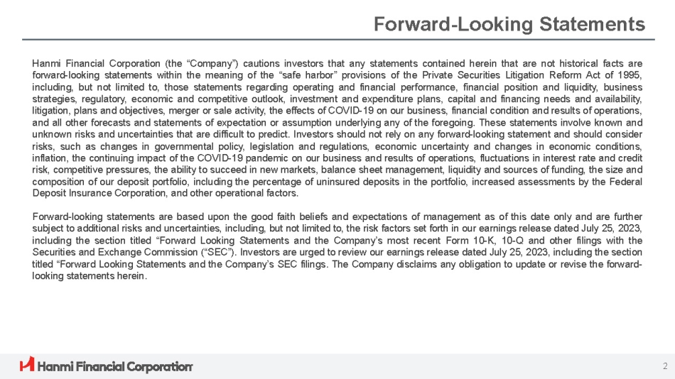 Hanmi Financial Corporation (the “Company”) cautions investors that any statements contained herein that are not historical facts are forward - looking statements within the meaning of the “safe harbor” provisions of the Private Securities Litigation Reform Act of 1995 , including, but not limited to, those statements regarding operating and financial performance, financial position and liquidity, business strategies, regulatory, economic and competitive outlook, investment and expenditure plans, capital and financing needs and availability, litigation, plans and objectives, merger or sale activity, the effects of COVID - 19 on our business, financial condition and results of operations, and all other forecasts and statements of expectation or assumption underlying any of the foregoing . These statements involve known and unknown risks and uncertainties that are difficult to predict . Investors should not rely on any forward - looking statement and should consider risks, such as changes in governmental policy, legislation and regulations, economic uncertainty and changes in economic conditions, inflation, the continuing impact of the COVID - 19 pandemic on our business and results of operations, fluctuations in interest rate and credit risk, competitive pressures, the ability to succeed in new markets, balance sheet management, liquidity and sources of funding, the size and composition of our deposit portfolio, including the percentage of uninsured deposits in the portfolio, increased assessments by the Federal Deposit Insurance Corporation, and other operational factors . Forward - looking statements are based upon the good faith beliefs and expectations of management as of this date only and are further subject to additional risks and uncertainties, including, but not limited to, the risk factors set forth in our earnings release dated July 25 , 2023 , including the section titled “Forward Looking Statements and the Company’s most recent Form 10 - K, 10 - Q and other filings with the Securities and Exchange Commission (“SEC”) . Investors are urged to review our earnings release dated July 25 , 2023 , including the section titled “Forward Looking Statements and the Company’s SEC filings . The Company disclaims any obligation to update or revise the forward - looking statements herein . 2 Forward - Looking Statements