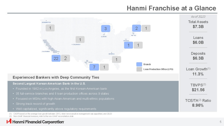 Hanmi Franchise at a Glance Loans $6.0B Deposits $6.3B TCE/TA (2) Ratio 8.96% Second Largest Korean - American Bank in the U.S. • Founded in 1982 in Los Angeles, as the first Korean - American bank • 35 full - service branches and 8 loan production offices across 9 states • Focused on MSAs with high Asian - American and multi - ethnic populations • Strong track record of growth • Well capitalized, significantly above regulatory requirements (1) CAGR based on the average loan growth between 2013, when new executive management was appointed, and 2Q23 (2) Non - GAAP financial measure; refer to the non - GAAP reconciliation slide Loan Growth (1) 11.3% TBVPS (2) $21.56 As of 2Q23 Total Assets $7.3B Experienced Bankers with Deep Community Ties 3 2 1 1 1 1 7 1 1 Branch Loan Production Office (LPO) 1 22 2 5