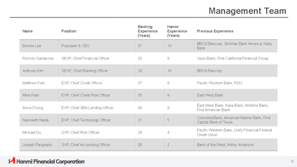 Previous Experience Hanmi Experience (Years) Banking Experience (Years) Position Name BBCN Bancorp, Shinhan Bank America, Nara Bank 10 37 President & CEO Bonnie Lee Opus Bank, First California Financial Group 8 32 SEVP, Chief Financial Officer Romolo Santarosa BBCN Bancorp 10 29 SEVP, Chief Banking Officer Anthony Kim Pacific Western Bank, FDIC 8 27 EVP, Chief Credit Officer Matthew Fuhr East West Bank 9 35 EVP, Chief Credit Risk Officer Mike Park East West Bank, Nara Bank, Wilshire Bank, First American Bank 9 40 EVP, Chief SBA Lending Officer Anna Chung Columbia Bank, American Marine Bank, First Capital Bank of Texas 5 21 EVP, Chief Technology Officer Navneeth Naidu Pacific Western Bank, Unify Financial Federal Credit Union 4 24 SVP, Chief Risk Officer Michael Du Bank of the West, Arthur Anderson 2 26 SVP, Chief Accounting Officer Joseph Pangrazio 6 Management Team