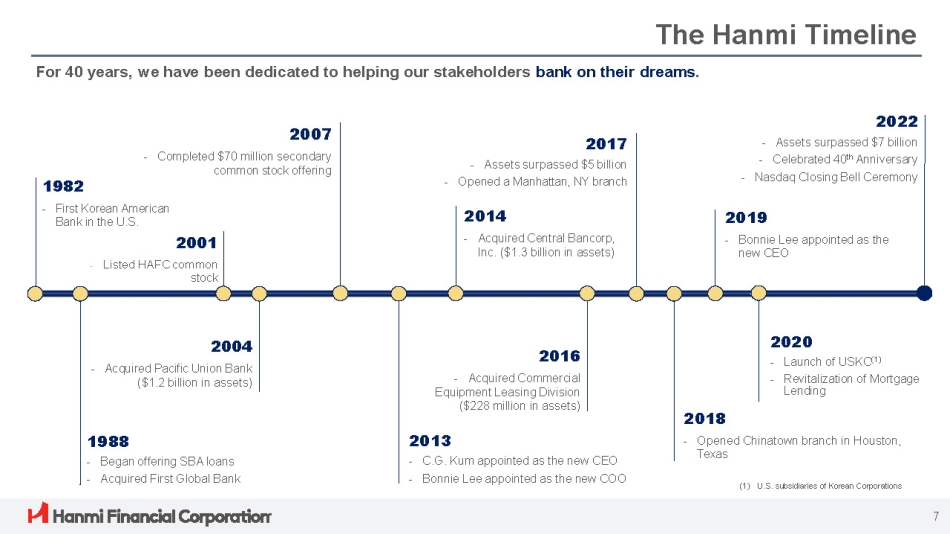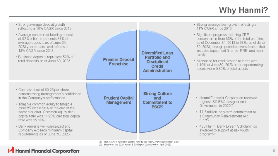 The Hanmi Timeline 1982 - First Korean American Bank in the U.S. 1988 - Began offering SBA loans - Acquired First Global Bank 2001 - Listed HAFC common stock 2004 - Acquired Pacific Union Bank ($1.2 billion in assets) 2007 - Completed $70 million secondary common stock offering 2013 - C.G. Kum appointed as the new CEO - Bonnie Lee appointed as the new COO 2014 - Acquired Central Bancorp, Inc. ($1.3 billion in assets) 2016 - Acquired Commercial Equipment Leasing Division ($228 million in assets) 2017 - Assets surpassed $5 billion - Opened a Manhattan, NY branch 2019 - Bonnie Lee appointed as the new CEO 2022 - Assets surpassed $7 billion - Celebrated 40 th Anniversary - Nasdaq Closing Bell Ceremony For 40 years, we have been dedicated to helping our stakeholders bank on their dreams . 7 2020 - Launch of USKC (1) - Revitalization of Mortgage Lending (1) U.S. subsidiaries of Korean Corporations 2018 - Opened Chinatown branch in Houston, Texas
