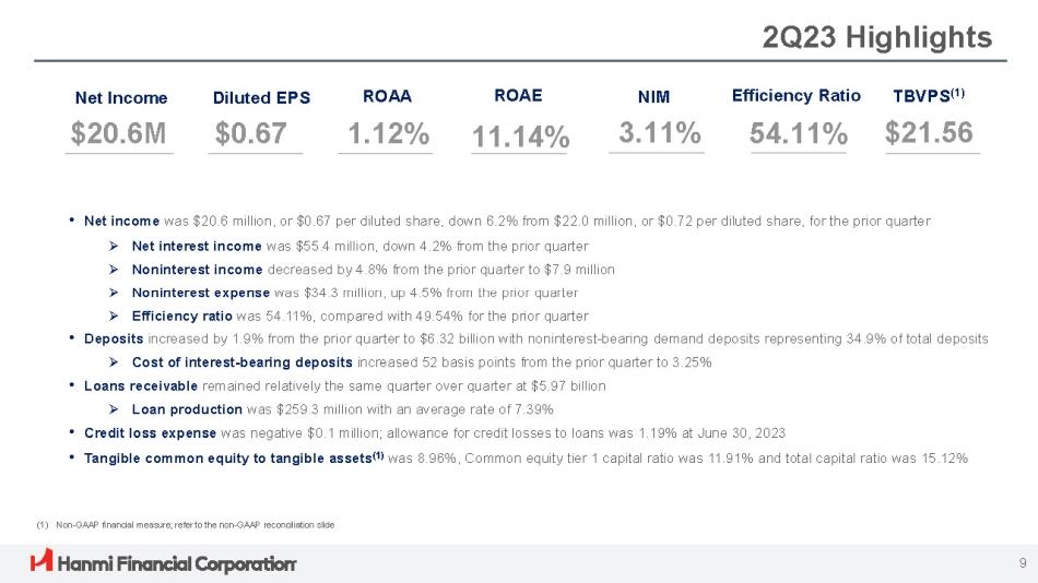 Why Hanmi? • Strong average loan growth reflecting an 11% CAGR since 2013 • Significant progress reducing CRE concentration from 85% of the total portfolio, as of December 31, 2013 to 63%, as of June 30, 2023, through portfolio diversification that includes equipment finance, RRE, and multi - family • Allowance for credit losses to loans was 1.19% at June 30, 2023 and nonperforming assets were 0.30% of total assets • Strong average deposit growth reflecting a 10% CAGR since 2013 • Average noninterest - bearing deposit at $2.3 billion, represents 37% of average deposits as of June 30, 2023 year - to - date, and reflects a 13% CAGR since 2013 • Business deposits represent 52% of total deposits as of June 30, 2023 Premier Deposit Franchise Diversified Loan Portfolio and Disciplined Credit Administration 8 Strong Culture and Commitment to ESG (2) Prudent Capital Management • Cash dividend of $0.25 per share, demonstrating management’s confidence in the Company’s performance • Tangible common equity to tangible assets (1) was 8.96% at the end of the second quarter. Common equity tier 1 capital ratio was 11.90% and total capital ratio was 15.11% • Bank remains well - capitalized and Company exceeds minimum capital requirements as of June 30, 2023 • Hanmi Financial Corporation received highest ISS ESG designation in Governance in 2022 (2) • $7.5 million long - term commitment to a Community Reinvestment Act fund (2) • 426 Hanmi Bank Dream Scholarships awarded to support at - risk youth program (2) (1) Non - GAAP financial measure; refer to the non - GAAP reconciliation slide (2) Based on the 2023 Hanmi ESG Report (published on April 2023)