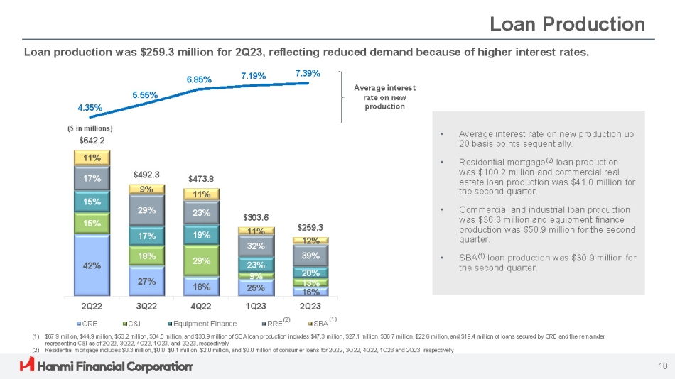 Loan Production 42% 27% 18% 15% 18% 29% 15% 17% 19% 23% 9% 25% 17% 29% 23% 11% $492.3 9% $473.8 11% $303.6 11% 32% $259.3 12% 39% 20% 13% 16% ($ in millions) $642.2 2Q22 3Q22 4Q22 1Q23 CRE C&I Equipment Finance RRE (2) 2Q23 (1) SBA • Average interest rate on new production up 20 basis points sequentially. • Residential mortgage (2) loan production was $100.2 million and commercial real estate loan production was $41.0 million for the second quarter. • Commercial and industrial loan production was $36.3 million and equipment finance production was $50.9 million for the second quarter. • SBA (1) loan production was $30.9 million for the second quarter. Loan production was $259.3 million for 2Q23, reflecting reduced demand because of higher interest rates. Average interest rate on new production (1) $67.9 million, $44.9 million, $53.2 million, $34.5 million, and $30.9 million of SBA loan production includes $47.3 million, $27.1 million, $36.7 million, $22.6 million, and $19.4 million of loans secured by CRE and the remainder representing C&I as of 2Q22, 3Q22, 4Q22, 1Q23, and 2Q23, respectively (2) Residential mortgage includes $0.3 million, $0.0, $0.1 million, $2.0 million, and $0.0 million of consumer loans for 2Q22, 3Q22, 4Q22, 1Q23 and 2Q23, respectively 4.35% 5.55% 6.85% 7.19% 7.39% 10