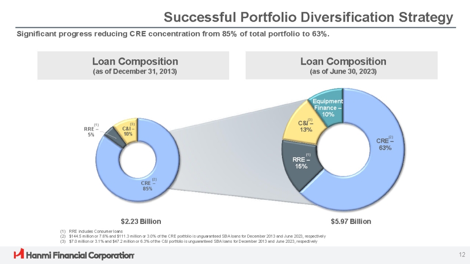 Average Loan Trend $4,039 $3,423 $2,902 $2,441 $2,157 $4,456 $4,508 $4,685 $4,795 $5,943 $5,597 2013 2014 2015 2016 2020 2021 2022 2023 YTD 2017 2018 2019 Average Loans Receivable Strong average loan growth reflecting an 11% CAGR since 2013. ($ in millions) 11