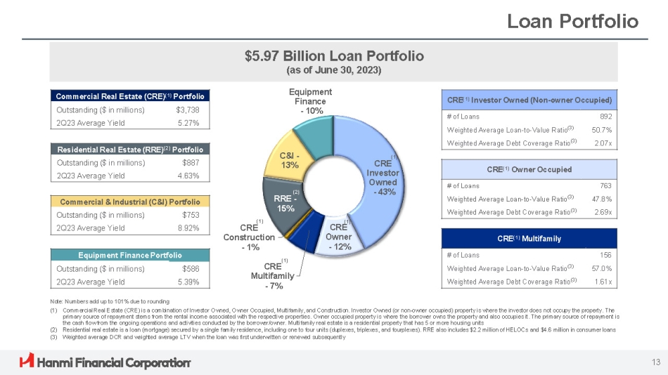 Successful Portfolio Diversification Strategy 12 Loan Composition (as of June 30, 2023) Loan Composition (as of December 31, 2013) $5.97 Billion $2.23 Billion (1) RRE includes Consumer loans (2) $144.5 million or 7.6% and $111.3 million or 3.0% of the CRE portfolio is unguaranteed SBA loans for December 2013 and June 2023, respectively (3) $7.0 million or 3.1% and $47.2 million or 6.3% of the C&I portfolio is unguaranteed SBA loans for December 2013 and June 2023, respectively CRE – 63% C&I – 13% Equipment Finance – 10% (1) RRE – 5% (1) RRE – 15% Significant progress reducing CRE concentration from 85% of total portfolio to 63%. (2) (3) (2) CRE – 85% (3) C&I – 10%