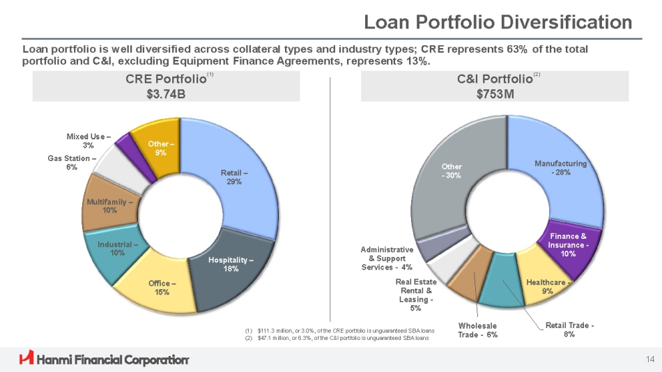 Loan Portfolio Commercial Real Estate (CRE) (1) Portfolio $3,738 Outstanding ($ in millions) 5.27% 2Q23 Average Yield $5.97 Billion Loan Portfolio (as of June 30, 2023) CRE 13 Owner - 12% CRE Multifamily - 7% C&I - 13% Equipment Finance - 10% (1) CRE Construction - 1% Note: Numbers add up to 101% due to rounding (1) Commercial Real Estate (CRE) is a combination of Investor Owned, Owner Occupied, Multifamily, and Construction. Investor Owned (or non - owner occupied) property is where the investor does not occupy the property. The primary source of repayment stems from the rental income associated with the respective properties. Owner occupied property is where the borrower owns the property and also occupies it. The primary source of repayment is the cash flow from the ongoing operations and activities conducted by the borrower/owner. Multifamily real estate is a residential property that has 5 or more housing units (2) Residential real estate is a loan (mortgage) secured by a single family residence, including one to four units (duplexes, triplexes, and fourplexes). RRE also includes $2.2 million of HELOCs and $4.6 million in consumer loans (3) Weighted average DCR and weighted average LTV when the loan was first underwritten or renewed subsequently CRE (1) Multifamily 156 # of Loans 57.0% Weighted Average Loan - to - Value Ratio (3) 1.61x Weighted Average Debt Coverage Ratio (3) CRE (1) Investor Owned (Non - owner Occupied) 892 # of Loans 50.7% Weighted Average Loan - to - Value Ratio (3) 2.07x Weighted Average Debt Coverage Ratio (3) CRE (1) Owner Occupied 763 # of Loans 47.8% Weighted Average Loan - to - Value Ratio (3) 2.69x Weighted Average Debt Coverage Ratio (3) Residential Real Estate (RRE) (2) Portfolio $887 Outstanding ($ in millions) 4.63% 2Q23 Average Yield Commercial & Industrial (C&I) Portfolio $753 Outstanding ($ in millions) 8.92% 2Q23 Average Yield Equipment Finance Portfolio $586 Outstanding ($ in millions) 5.39% 2Q23 Average Yield (1) (1) (1) CRE Investor Owned - 43% (2) RRE - 15%