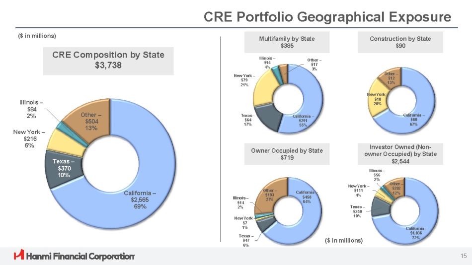 Loan Portfolio Diversification Loan portfolio is well diversified across collateral types and industry types; CRE represents 63% of the total portfolio and C&I, excluding Equipment Finance Agreements, represents 13%. CRE Portfolio (1) $3.74B C&I Portfolio (2) $753M Retail – 29% Hospitality – 18% Office – 15% Industrial – 10% Multifamily – 10% Mixed Use – 3% Gas Station – 6% Other – 9% Manufacturing - 28% 14 Finance & Insurance - 10% Healthcare - 9% Retail Trade - 8% Wholesale Trade - 6% Administrative & Support Services - 4% Real Estate Rental & Leasing - 5% Other - 30% (1) $111.3 million, or 3.0%, of the CRE portfolio is unguaranteed SBA loans (2) $47.1 million, or 6.3%, of the C&I portfolio is unguaranteed SBA loans