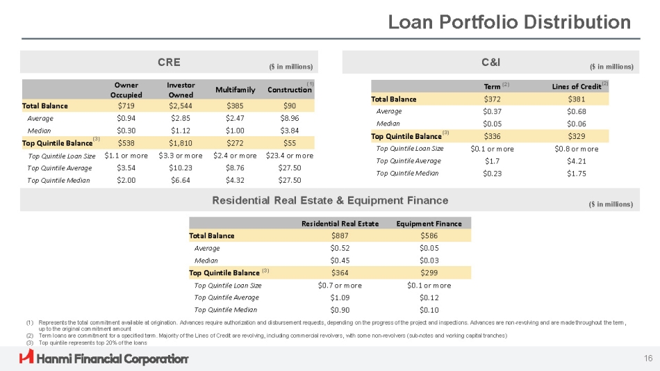 CRE Portfolio Geographical Exposure CRE Composition by State $3,738 Multifamily by State $385 Construction by State $90 Owner Occupied by State $719 Investor Owned (Non - owner Occupied) by State $2,544 California – $2,565 69% Texas – $370 10% New York – $216 6% Illinois – $84 2% Other – $504 13% California – $211 55% Texas - $64 17% New York – $79 21% Illinois – $14 4% Other – $17 3% California – $60 67% New York – $18 20% Other – $12 13% California - $458 64% Texas – $47 6% New York – $7 1% Illinois – $14 2% Other – $193 27% California - $1,836 72% 15 Texas – $259 10% Illinois – $56 2% New York – $111 4% Other – $282 12% ($ in millions) ($ in millions)