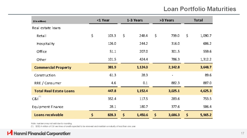 Loan Portfolio Distribution CRE C&I ($ in millions) ($ in millions) (1) Construction Multifamily Investor Owned Owner Occupied $90 $385 $2,544 $719 Total Balance $8.96 $2.47 $2.85 $0.94 Average $3.84 $1.00 $1.12 $0.30 Median $55 $272 $1,810 $538 (3) Top Quintile Balance $23.4 or more $2.4 or more $3.3 or more $1.1 or more Top Quintile Loan Size $27.50 $8.76 $10.23 $3.54 Top Quintile Average $27.50 $4.32 $6.64 $2.00 Top Quintile Median Lines of Credit (2) Term (2) $381 $372 Total Balance $0.68 $0.37 Average $0.06 $0.05 Median $329 $336 (3) Top Quintile Balance $0.8 or more $0.1 or more Top Quintile Loan Size $4.21 $1.7 Top Quintile Average $1.75 $0.23 Top Quintile Median Residential Real Estate & Equipment Finance 16 Equipment Finance Residential Real Estate $586 $887 Total Balance $0.05 $0.52 Average $0.03 $0.45 Median $299 $364 Top Quintile Balance (3) $0.1 or more $0.7 or more Top Quintile Loan Size $0.12 $1.09 Top Quintile Average $0.10 $0.90 Top Quintile Median ($ in millions) (1) Represents the total commitment available at origination. Advances require authorization and disbursement requests, depending on the progress of the project and inspections. Advances are non - revolving and are made throughout the term, up to the original commitment amount (2) Term loans are commitment for a specified term. Majority of the Lines of Credit are revolving, including commercial revolvers, with some non - revolvers (sub - notes and working capital tranches) (3) Top quintile represents top 20% of the loans