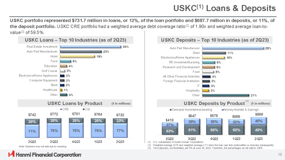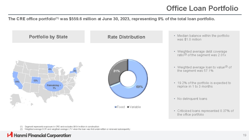 USKC (1) Loans & Deposits USKC portfolio represented $731.7 million in loans, or 12%, of the loan portfolio and $687.7 million in deposits, or 11%, of the deposit portfolio. USKC CRE portfolio had a weighted average debt coverage ratio (2) of 1.90x and weighted average loan - to - value (2) of 59.5%. 3% Golf Course 2% Electronics/Home Appliances 2% Computer Equipment 2% Steel 1% Healthcare 4% Other USKC Loans – Top 10 Industries (as of 2Q23) 34% Real Estate Investment 23% Auto Part Manufacturer 19% Hotel 6% Food 4% Education 71% 75% 75% 75% 77% $742 28% $772 26% $781 25% $764 25% $732 23% 4Q22 1Q23 2Q23 CRE C&I USKC Loans by Product ($ in millions) 2Q22 3Q22 Note: Numbers may not add due to rounding 21% 28% Auto Part Manufacurer 11% Steel 10% Electronics/Home Appliances 6% RE Investment/Leasing 6% Research and Development 5% Food 4% All Other Financial Activities 3% Foreign Financial Institution 3% IT 3% Hospitality Other USKC Deposits – Top 10 Industries (as of 2Q23) 61% 58% 60% 49% $418 37% 63% $547 38% $575 38% $565 32% $688 46% 2Q22 3Q22 4Q22 1Q23 2Q23 Demand Noninterest - bearing Money Market & Savings USKC Deposits by Product 18 ($ in millions) (1) U.S. subsidiaries of South Korean Corporations (2) (3) Weighted average DCR and weighted average LTV when the loan was first underwritten or renewed subsequently Time deposits, not illustrated, are 5% at June 30, 2023. Therefore, the percentages do not add to 100% (3)