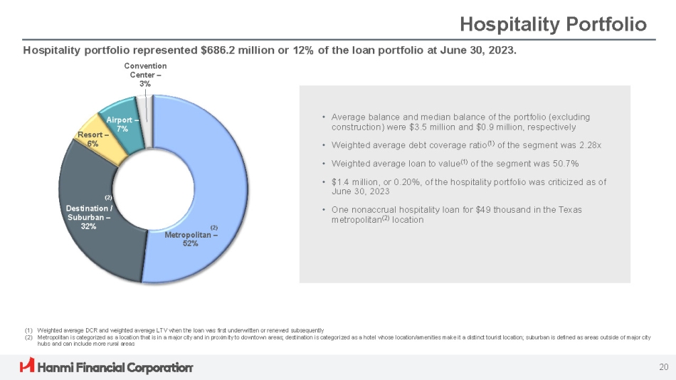 Office Loan Portfolio The CRE office portfolio (1) was $559.6 million at June 30, 2023, representing 9% of the total loan portfolio. 79% 13% 4% Remaining = 1% 3% Portfolio by State • Median balance within the portfolio was $1.0 million • Weighted average debt coverage ratio (2) of the segment was 2.01x • Weighted average loan to value (2) of the segment was 57.1% • 19.2% of the portfolio is expected to reprice in 1 to 3 months • No delinquent loans • Criticized loans represented 0.37% of the office portfolio Rate Distribution (1) Segment represents exposure in CRE and excludes $18.4 million in construction (2) Weighted average DCR and weighted average LTV when the loan was first underwritten or renewed subsequently 69% 31% Fixed Variable 19