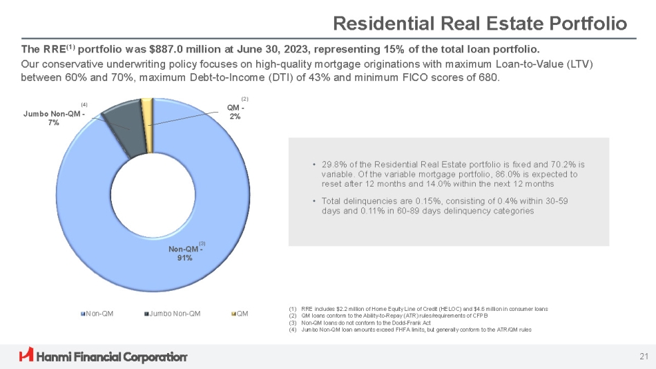Residential Real Estate Portfolio (2) QM - 2% (3) Non - QM - 91% (4) Jumbo Non - QM - 7% Non - QM Jumbo Non - QM QM 21 The RRE (1) portfolio was $887.0 million at June 30, 2023, representing 15% of the total loan portfolio. Our conservative underwriting policy focuses on high - quality mortgage originations with maximum Loan - to - Value (LTV) between 60% and 70%, maximum Debt - to - Income (DTI) of 43% and minimum FICO scores of 680. (1) RRE includes $2.2 million of Home Equity Line of Credit (HELOC) and $4.6 million in consumer loans (2) QM loans conform to the Ability - to - Repay (ATR) rules/requirements of CFPB (3) Non - QM loans do not conform to the Dodd - Frank Act (4) Jumbo Non - QM loan amounts exceed FHFA limits, but generally conform to the ATR/QM rules • 29.8% of the Residential Real Estate portfolio is fixed and 70.2% is variable. Of the variable mortgage portfolio, 86.0% is expected to reset after 12 months and 14.0% within the next 12 months • Total delinquencies are 0.15%, consisting of 0.4% within 30 - 59 days and 0.11% in 60 - 89 days delinquency categories