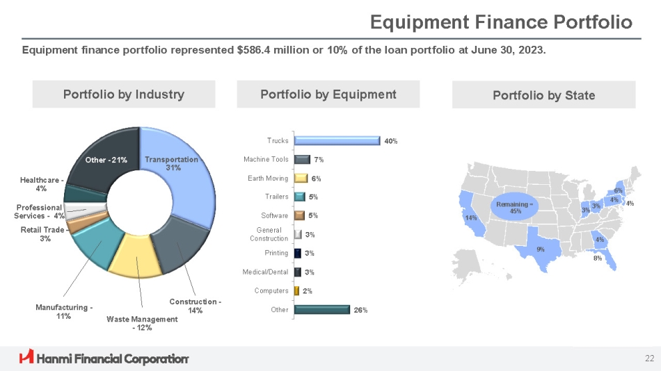 Equipment Finance Portfolio Equipment finance portfolio represented $586.4 million or 10% of the loan portfolio at June 30, 2023. Transportation - 31% Construction - 14% Waste Management - 12% Manufacturing - 11% Professional Services - 4% Retail Trade – 3% Healthcare - 4% Other - 21% 40% 7% 6% 5% 5% 3% 3% 3% 2% 26% Trucks Machine Tools Earth Moving Trailers Software General Construction Printing Medical/Dental Computers Other Portfolio by Industry Portfolio by Equipment Portfolio by State 14% 22 9% 4% 8% 6% 4% 3% 3% Remaining = 45% 4%
