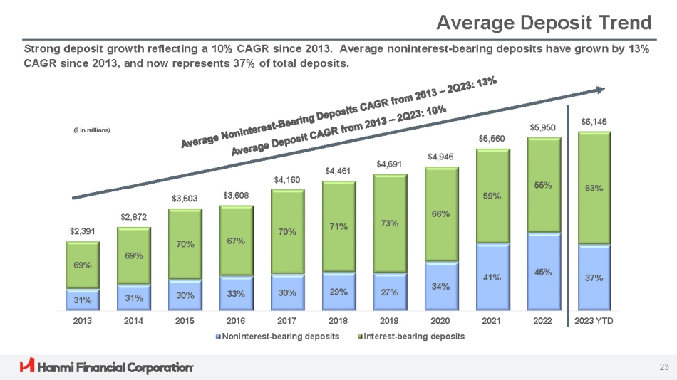 31% 31% 30% 33% 30% 29% 27% 34% 41% 45% 37% 69% 69% 70% 67% 70% 71% 73% 66% 59% 55% 63% $2,391 $2,872 $3,503 $3,608 $4,160 $4,461 $4,691 $5,560 $4,946 $5,950 $6,145 2013 2014 2015 2021 2022 2023 YTD 2016 2017 2018 Noninterest - bearing deposits 2019 2020 Interest - bearing deposits ($ in millions) Strong deposit growth reflecting a 10% CAGR since 2013. Average noninterest - bearing deposits have grown by 13% CAGR since 2013, and now represents 37% of total deposits. 23 Average Deposit Trend