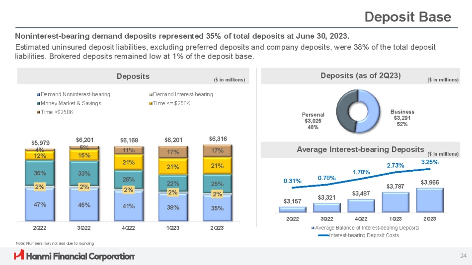 0.31% 0.78% 1.70% 2.73% 3.25% $3,157 $3,321 $3,487 $3,787 $3,966 3Q22 4Q22 1Q23 Average Balance of Interest - bearing Deposits Interest - bearing Deposit Costs 2Q22 2Q23 Deposit Base Noninterest - bearing demand deposits represented 35% of total deposits at June 30, 2023. Estimated uninsured deposit liabilities, excluding preferred deposits and company deposits, were 38% of the total deposit liabilities. Brokered deposits remained low at 1% of the deposit base. 2Q22 3Q22 Note: Numbers may not add due to rounding Deposits ($ in millions) Deposits (as of 2Q23) Average Interest - bearing Deposits ($ in millions) Business $3,291 52% Personal $3,025 48% ($ in millions) 47% 45% 41% 38% 35% 2% 2% 2% 2% 2% 35% 33% 25% 22% 25% 21% 21% $5,979 4% 12% $6,201 5% 15% $6,168 11% 21% $6,201 17% $6,316 17% 4Q22 1Q23 2Q23 Demand Noninterest - bearing Money Market & Savings Time >$250K Demand Interest - bearing Time <= $250K 24