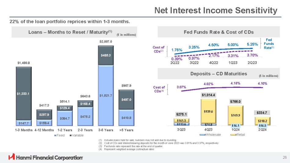 Net Interest Income | Net Interest Margin Net interest income for the second quarter was $55.4 million and net interest margin (taxable equivalent) was 3.11%, both down from the previous quarter because of higher deposit interest expense. $59.0 $63.1 $64.6 $57.9 $55.4 3.55% 3.66% 3.67% 3.28% 3.11% 2Q22 3Q22 4Q22 1Q23 2Q23 Net Interest Income NIM ($ in millions) 3.28% 3.11% 0.09% 0.04% 0.04% 0.01% - 0.35% 1Q23 Loans IB - deposits FHLB Borrowings Sub debt and Other liabilities 2Q23 Int - bearing deposits at banks NIM Increase Decrease 25