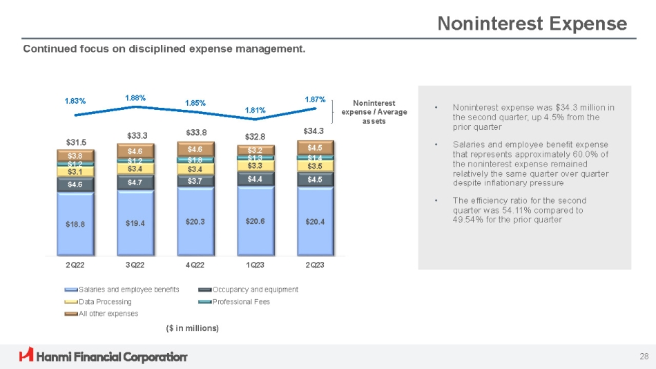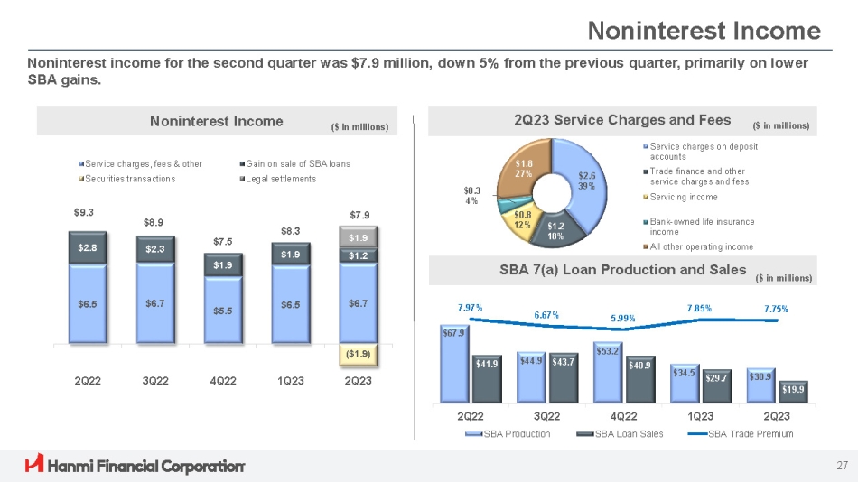 $2.6 39% $1.2 18% $0.8 12% $0.3 4% $1.8 27% Service charges on deposit accounts Trade finance and other service charges and fees Servicing income Bank - owned life insurance income All other operating income Noninterest Income SBA 7(a) Loan Production and Sales ($ in millions) $67.9 $44.9 $53.2 $34.5 $30.9 $41.9 $43.7 $40.9 $29.7 6.67% 5.99% 7.97% 7.85% 7.75% 2Q22 3Q22 4Q22 SBA Loan Sales SBA Production $19.9 1Q23 2Q23 SBA Trade Premium Noninterest income for the second quarter was $7.9 million, down 5% from the previous quarter, primarily on lower SBA gains. Noninterest Income 2Q23 Service Charges and Fees ($ in millions) ($ in millions) $6.5 $6.7 $5.5 $6.5 $6.7 $2.8 $2.3 $1.9 $1.9 $1.9 $1.2 $9.3 $8.9 $7.5 $8.3 $7.9 2Q22 3Q22 4Q22 1Q23 2Q23 Service charges, fees & other Securities transactions Gain on sale of SBA loans Legal settlements Total noninterest income ($1.9) 27