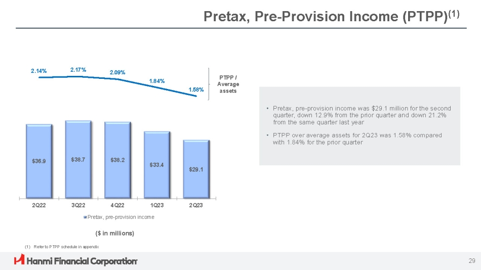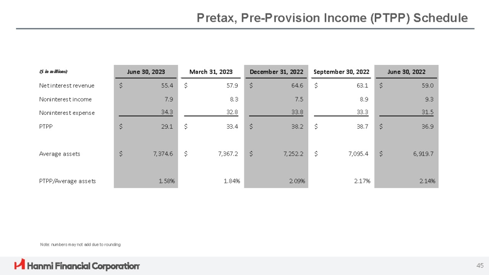 Pretax, Pre - Provision Income (PTPP) Schedule Note: numbers may not add due to rounding June 30, 2023 March 31, 2023 December 31, 2022 June 30, 2022 $ 57.9 $ 55.4 $ 7.9 8.3 September 30, 2022 64.6 $ 63.1 $ 7.5 8.9 59.0 9.3 34.3 $ 29.1 32.8 $ 33.4 33.8 $ 38.2 33.3 $ 38.7 31.5 $ 36.9 $ 7,374.6 $ 7,367.2 $ 7,252.2 $ 6,919.7 7,095.4 $ ($ in millions) Net interest revenue Noninterest income Noninterest expense PTPP Average assets PTPP/Average assets 1.58% 1.84% 2.09% 2.17% 2.14% 45