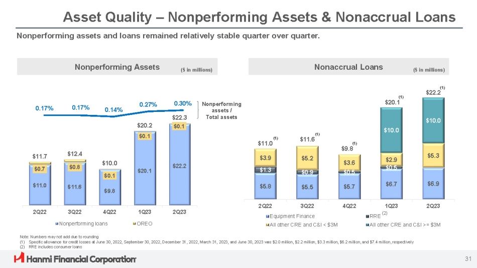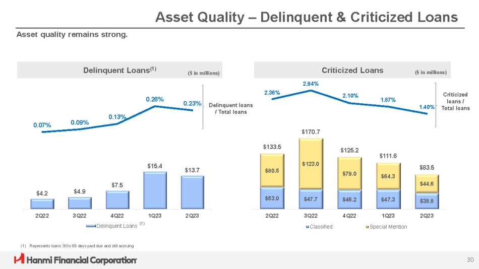 Asset Quality – Delinquent & Criticized Loans Delinquent loans / Total loans $53.0 $47.7 $46.2 $47.3 $38.8 $80.5 $123.0 $79.0 $64.3 $44.6 $133.5 $170.7 $125.2 $111.6 $83.5 2.36% 2.94% 2.10% 1.87% 1.40% 2Q22 3Q22 4Q22 1Q23 2Q23 Classified Special Mention Delinquent Loans (1) Criticized Loans Criticized loans / Total loans Asset quality remains strong. $4.2 $4.9 $7.5 $15.4 $13.7 0.07% 0.09% 0.13% 0.26% 0.23% 2Q22 3Q22 1Q23 2Q23 4Q22 Delinquent Loans (1) 30 ($ in millions) ($ in millions) (1) Represents loans 30 to 89 days past due and still accruing