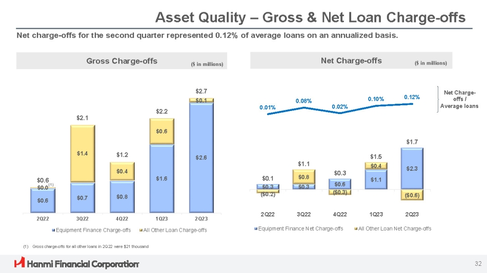 $11.0 $11.6 $9.8 2Q22 2Q23 3Q22 4Q22 1Q23 Nonperforming loans OREO Asset Quality – Nonperforming Assets & Nonaccrual Loans Nonperforming Assets Nonaccrual Loans Nonperforming assets and loans remained relatively stable quarter over quarter. ($ in millions) ($ in millions) Note: Numbers may not add due to rounding (1) Specific allowance for credit losses at June 30, 2022, September 30, 2022, December 31, 2022, March 31, 2023, and June 30, 2023 was $2.0 million, $2.2 million, $3.3 million, $6.2 million, and $7.4 million, respectively (2) RRE includes consumer loans $0.5 $6.9 $6.7 $5.7 $5.5 $5.8 2Q23 1Q23 4Q22 3Q22 2Q22 Equipment Finance RRE All other CRE and C&I < $3M All other CRE and C&I >= $3M 31 (2) (1) $22.2 (1) $20.1 Nonperforming assets / 0.30% 0.27% 0.14% 0.17% 0.17% $10.0 $5.3 $10.0 $2.9 (1) $9.8 $3.6 $0.5 (1) $11.6 $5.2 $0.9 (1) $11.0 $3.9 $1.3 Total assets $22.3 $0.1 $22.2 $20.2 $0.1 $20.1 $10.0 $0.1 $12.4 $0.8 $11.7 $0.7
