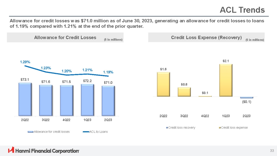 $1.1 $2.3 ($0.2) $0.8 $0.3 ($0.6) $0.1 $0.3 $1.1 $0.3 $0.6 ($0.3) $1.5 $0.4 $1.7 0.01% 0.08% 0.02% 0.10% 0.12% 2Q22 3Q22 4Q22 Equipment Finance Net Charge - offs 1Q23 2Q23 All Other Loan Net Charge - offs Asset Quality – Gross & Net Loan Charge - offs Gross Charge - offs Net Charge - offs Net Charge - offs / Average loans Net charge - offs for the second quarter represented 0.12% of average loans on an annualized basis. ($ in millions) ($ in millions) $0.7 $0.8 $1.6 $2.6 $1.4 $0.4 $0.6 $2.1 $1.2 $2.2 $2.7 $0.1 $0.6 (1) $0.0 $0.6 2Q22 3Q22 4Q22 Equipment Finance Charge - offs 1Q23 2Q23 All Other Loan Charge - offs (1) Gross charge - offs for all other loans in 2Q22 were $21 thousand 32