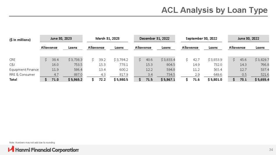 ACL Trends Allowance for credit losses was $71.0 million as of June 30, 2023, generating an allowance for credit losses to loans of 1.19% compared with 1.21% at the end of the prior quarter. $73.1 $71.6 $71.5 $72.2 $71.0 1.29% 1.23% 1.20% 1.21% 1.19% 2Q22 3Q22 4Q22 1Q23 2Q23 Allowance for credit losses ACL to Loans ($0.1) $1.6 $0.6 $0.1 $2.1 2Q22 3Q22 4Q22 1Q23 2Q23 Credit loss recovery Credit loss expense Allowance for Credit Losses Credit Loss Expense (Recovery) 33 ($ in millions) ($ in millions)