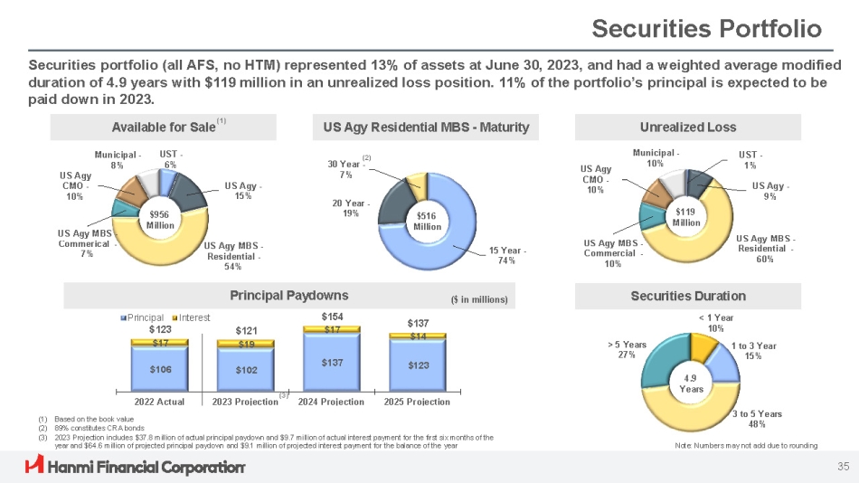 ACL Analysis by Loan Type June 30, 2022 September 30, 2022 December 31, 2022 March 31, 2023 June 30, 2023 ($ in millions) Loans Allowance Loans Allowance Loans Allowance Loans Allowance Loans Allowance $ 3,829.7 $ 45.6 $ 3,853.9 $ 42.7 $ 3,833.4 $ 40.6 $ 3,784.2 $ 39.2 $ 3,738.3 $ 38.4 CRE 766.8 14.3 732.0 14.9 804.5 15.3 778.1 15.3 753.5 16.0 C&I 537.4 12.7 565.4 11.2 594.8 12.2 600.2 13.4 586.4 11.9 Equipment Finance 521.6 0.5 649.6 2.9 734.5 3.4 817.9 4.3 887.0 4.7 RRE & Consumer $ 5,655.4 $ 73.1 $ 5,801.0 $ 71.6 $ 5,967.1 $ 71.5 $ 5,980.5 $ 72.2 $ 5,965.2 $ 71.0 Total Note: Numbers may not add due to rounding 34