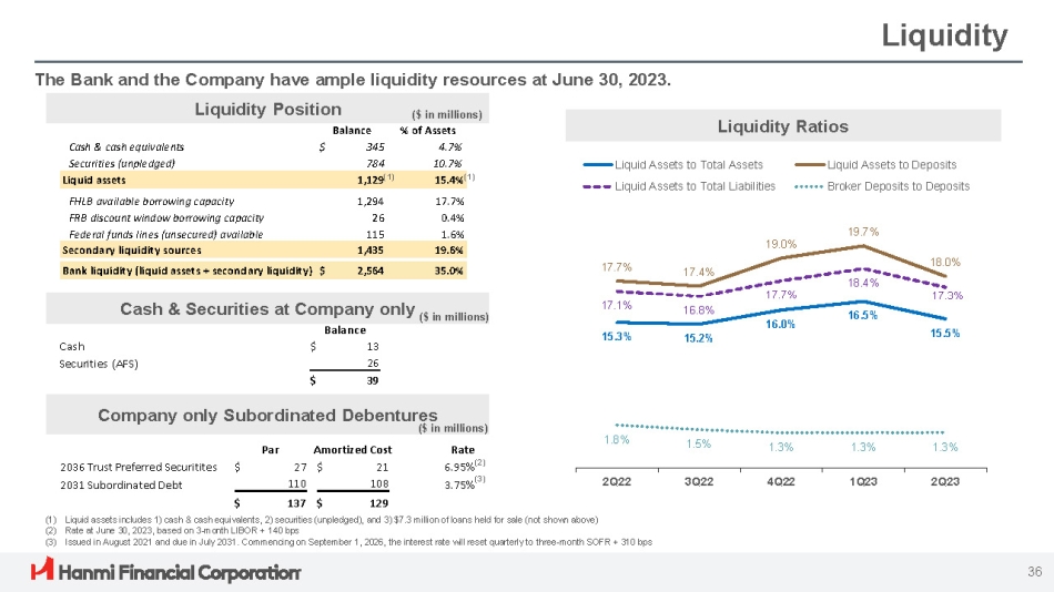 4.7% $ 345 Cash & cash equivalents Liquid Assets to Deposits Liquid Assets to Total Assets 10.7% 784 Securities (unpledged) Broker Deposits to Deposits 1) Liquid Assets to Total Liabilities 15.4% ( 1,129 (1) Liquid assets 17.7% 1,294 FHLB available borrowing capacity 0.4% 26 FRB discount window borrowing capacity 1.6% 115 Federal funds lines (unsecured) available 19.6% 1,435 Secondary liquidity sources 35.0% $ 2,564 Bank liquidity (liquid assets + secondary liquidity) Balance % of Assets Liquidity The Bank and the Company have ample liquidity resources at June 30, 2023. (1) Liquid assets includes 1) cash & cash equivalents, 2) securities (unpledged), and 3) $7.3 million of loans held for sale (not shown above) (2) Rate at June 30, 2023, based on 3 - month LIBOR + 140 bps (3) Issued in August 2021 and due in July 2031. Commencing on September 1, 2026, the interest rate will reset quarterly to three - month SOFR + 310 bps Liquidity Position ($ in millions) 15.3% 15.2% 16.0% 16.5% 15.5% 17.7% 17.4% 19.7% 19.0% 18.0% 17.1% 16.8% 17.7% 18.4% 17.3% 1.8% 1.5% 1.3% 1.3% 1.3% 2Q22 3Q22 4Q22 1Q23 2Q23 Liquidity Ratios 36 2036 Trust Preferred Securitites $ Par Amortized Cost 27 $ 21 Rate 6.95% (2) (3) 3.75% 108 110 2031 Subordinated Debt $ 129 $ 137 Company only Subordinated Debentures ($ in millions) Cash & Securities at Company only ($ in millions) Balance Cash $ 13 Securities (AFS) 26 $ 39