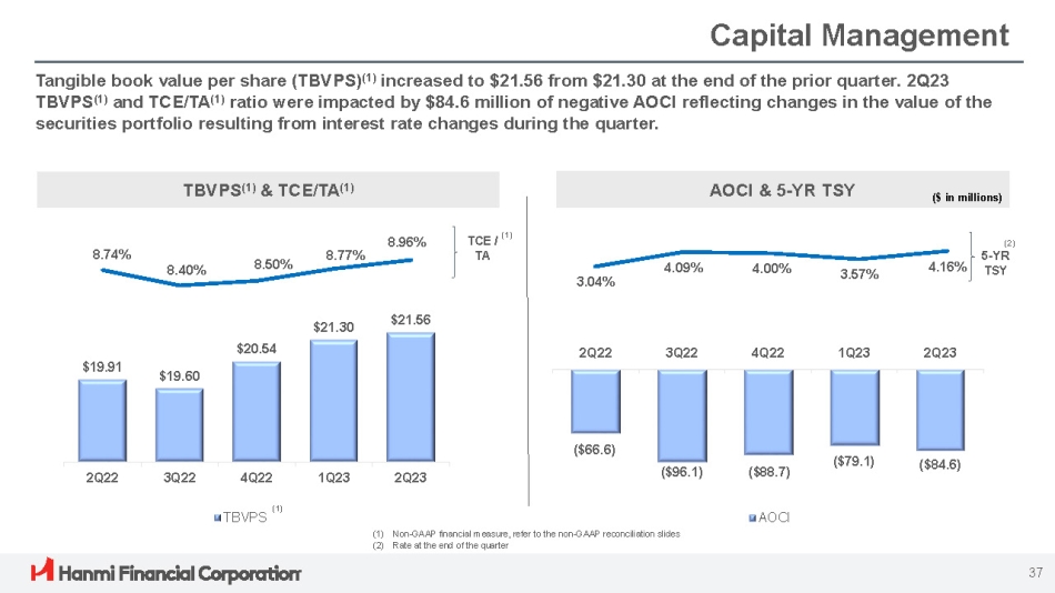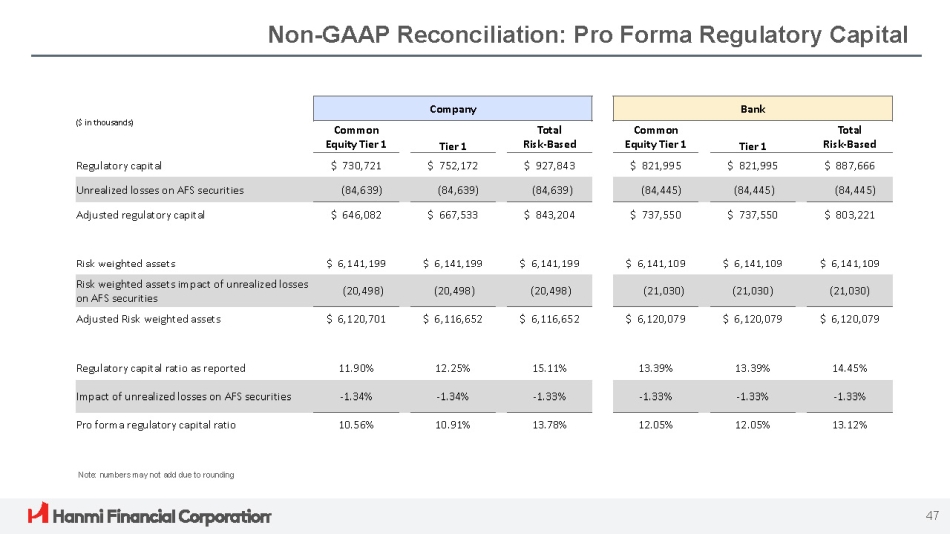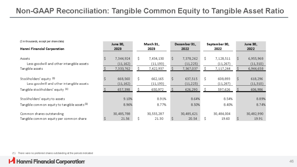 Non - GAAP Reconciliation: Tangible Common Equity to Tangible Asset Ratio 46 (1) There were no preferred shares outstanding at the periods indicated June 30, September 30, December 31, March 31, June 30, 2022 2022 2022 2023 2023 Hanmi Financial Corporation $ 6,955,968 $ 7,128,511 $ 7,378,262 $ 7,434,130 $ 7,344,924 Assets (11,310) (11,267) (11,225) (11,193) (11,162) Less goodwill and other intangible assets $ 6,944,658 $ 7,117,244 $ 7,367,037 $ 7,422,937 $ 7,333,762 Tangible assets $ 618,296 $ 608,893 $ 637,515 $ 662,165 $ 668,560 Stockholders' equity (1) (11,310) (11,267) (11,225) (11,193) (11,162) Less goodwill and other intangible assets $ 606,986 $ 597,626 $ 626,290 $ 650,972 $ 657,398 Tangible stockholders' equity (1) 8.89% 8.54% 8.64% 8.91% 9.10% Stockholders' equity to assets 8.74% 8.40% 8.50% 8.77% 8.96% Tangible common equity to tangible assets (1) 30,482,990 30,484,004 30,485,621 30,555,287 30,485,788 Common shares outstanding $ 19.91 $ 19.60 $ 20.54 $ 21.30 $ 21.56 Tangible common equity per common share ($ in thousands, except per share data)