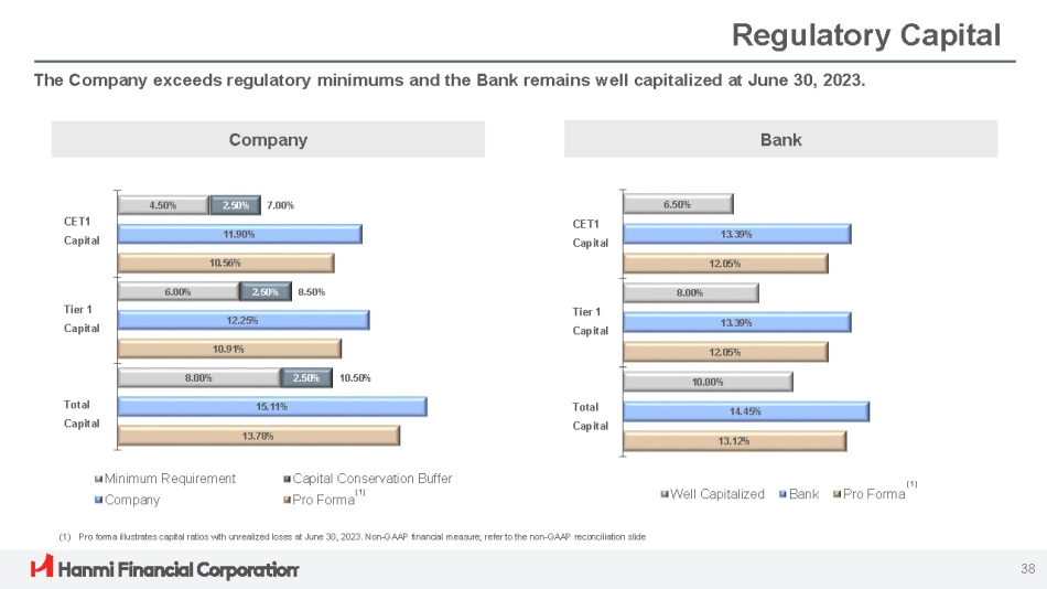 (1) Non - GAAP financial measure, refer to the non - GAAP reconciliation slides (2) Rate at the end of the quarter Capital Management Tangible book value per share (TBVPS) (1) increased to $21.56 from $21.30 at the end of the prior quarter. 2Q23 TBVPS (1) and TCE/TA (1) ratio were impacted by $84.6 million of negative AOCI reflecting changes in the value of the securities portfolio resulting from interest rate changes during the quarter. 3.04% 4.09% 4.00% 3.57% 4.16% ($66.6) ($96.1) ($88.7) ($79.1) ($84.6) 2Q22 3Q22 4Q22 1Q23 2Q23 AOCI $19.91 $19.60 $20.54 $21.30 $21.56 8.74% 8.40% 8.50% 8.77% 8.96% 2Q22 3Q22 4Q22 1Q23 2Q23 (1) TBVPS TBVPS (1) & TCE/TA (1) AOCI & 5 - YR TSY (2) 5 - YR TSY TCE / (1) TA ($ in millions) 37