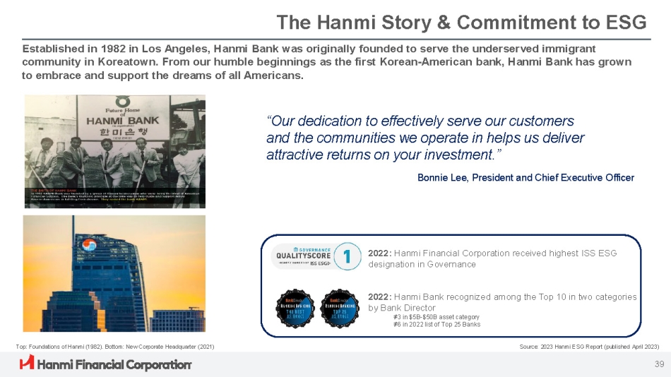 Top: Foundations of Hanmi (1982). Bottom: New Corporate Headquarter (2021) The Hanmi Story & Commitment to ESG Established in 1982 in Los Angeles, Hanmi Bank was originally founded to serve the underserved immigrant community in Koreatown. From our humble beginnings as the first Korean - American bank, Hanmi Bank has grown to embrace and support the dreams of all Americans. “Our dedication to effectively serve our customers and the communities we operate in helps us deliver attractive returns on your investment.” Bonnie Lee, President and Chief Executive Officer 2022: Hanmi Financial Corporation received highest ISS ESG designation in Governance 39 2022: Hanmi Bank recognized among the Top 10 in two categories by Bank Director #3 in $5B - $50B asset category #6 in 2022 list of Top 25 Banks Source: 2023 Hanmi ESG Report (published April 2023)