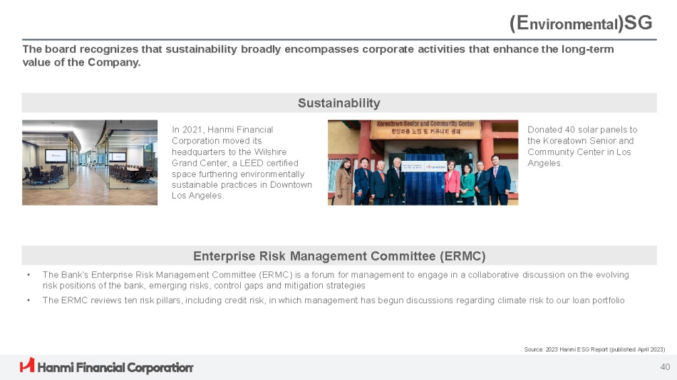 The board recognizes that sustainability broadly encompasses corporate activities that enhance the long - term value of the Company. (E nvironmental )SG Donated 40 solar panels to the Koreatown Senior and Community Center in Los Angeles. Source: 2023 Hanmi ESG Report (published April 2023) 40 Sustainability Enterprise Risk Management Committee (ERMC) In 2021, Hanmi Financial Corporation moved its headquarters to the Wilshire Grand Center, a LEED certified space furthering environmentally sustainable practices in Downtown Los Angeles. • The Bank’s Enterprise Risk Management Committee (ERMC) is a forum for management to engage in a collaborative discussion on the evolving risk positions of the bank, emerging risks, control gaps and mitigation strategies • The ERMC reviews ten risk pillars, including credit risk, in which management has begun discussions regarding climate risk to our loan portfolio