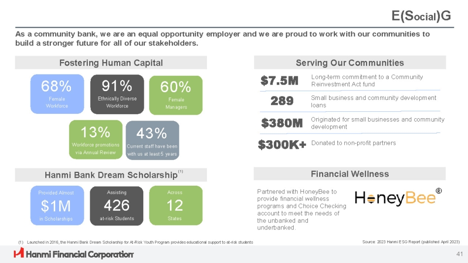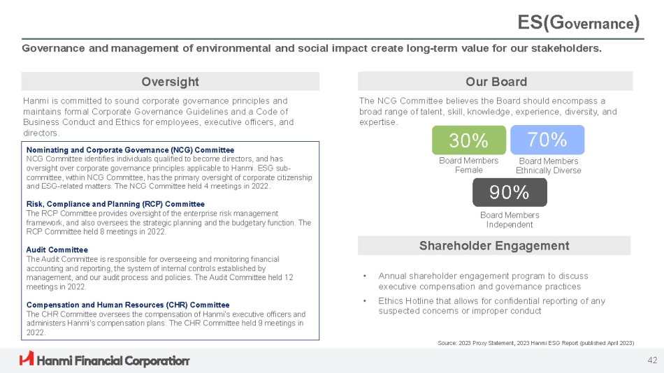As a community bank, we are an equal opportunity employer and we are proud to work with our communities to build a stronger future for all of our stakeholders. E(S ocial )G Source: 2023 Hanmi ESG Report (published April 2023) Fostering Human Capital 68% Female Workforce 91% Ethnically Diverse Workforce 60% Female Managers 43% Current staff have been with us at least 5 years 13% Workforce promotions via Annual Review Hanmi Bank Dream Scholarship Provided Almost $1M in Scholarships Assisting 426 at - risk Students Across 12 States Serving Our Communities $7.5M Long - term commitment to a Community Reinvestment Act fund 289 Small business and community development loans Financial Wellness $380M Originated for small businesses and community development $300K+ Donated to non - profit partners Partnered with HoneyBee to provide financial wellness programs and Choice Checking account to meet the needs of the unbanked and underbanked. 41 (1) (1) Launched in 2016, the Hanmi Bank Dream Scholarship for At - Risk Youth Program provides educational support to at - risk students