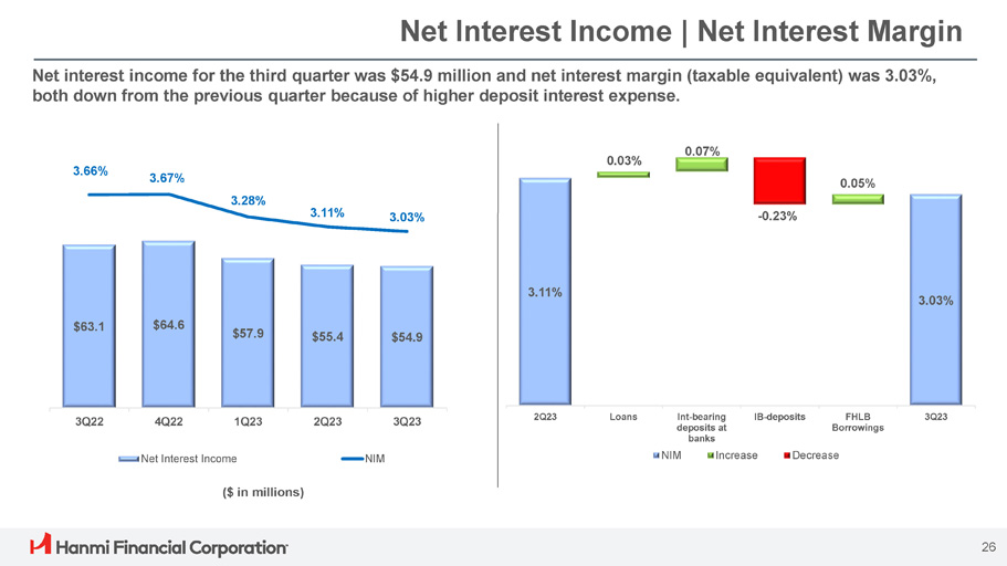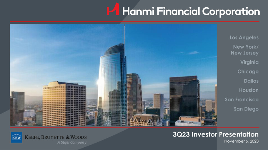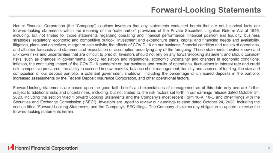 Hanmi Financial Corporation (the “Company”) cautions investors that any statements contained herein that are not historical facts are forward - looking statements within the meaning of the “safe harbor” provisions of the Private Securities Litigation Reform Act of 1995 , including, but not limited to, those statements regarding operating and financial performance, financial position and liquidity, business strategies, regulatory, economic and competitive outlook, investment and expenditure plans, capital and financing needs and availability, litigation, plans and objectives, merger or sale activity, the effects of COVID - 19 on our business, financial condition and results of operations, and all other forecasts and statements of expectation or assumption underlying any of the foregoing . These statements involve known and unknown risks and uncertainties that are difficult to predict . Investors should not rely on any forward - looking statement and should consider risks, such as changes in governmental policy, legislation and regulations, economic uncertainty and changes in economic conditions, inflation, the continuing impact of the COVID - 19 pandemic on our business and results of operations, fluctuations in interest rate and credit risk, competitive pressures, the ability to succeed in new markets, balance sheet management, liquidity and sources of funding, the size and composition of our deposit portfolio, a potential government shutdown, including the percentage of uninsured deposits in the portfolio, increased assessments by the Federal Deposit Insurance Corporation, and other operational factors . Forward - looking statements are based upon the good faith beliefs and expectations of management as of this date only and are further subject to additional risks and uncertainties, including, but not limited to, the risk factors set forth in our earnings release dated October 24 , 2023 , including the section titled “Forward Looking Statements and the Company’s most recent Form 10 - K, 10 - Q and other filings with the Securities and Exchange Commission (“SEC”) . Investors are urged to review our earnings release dated October 24 , 2023 , including the section titled “Forward Looking Statements and the Company’s SEC filings . The Company disclaims any obligation to update or revise the forward - looking statements herein . 2 Forward - Looking Statements