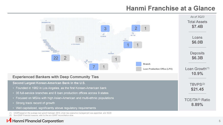 Hanmi Franchise at a Glance Loans $6.0B Deposits $6.3B TCE/TA (2) Ratio 8.89% Second Largest Korean - American Bank in the U.S. • Founded in 1982 in Los Angeles, as the first Korean - American bank • 35 full - service branches and 8 loan production offices across 9 states • Focused on MSAs with high Asian - American and multi - ethnic populations • Strong track record of growth • Well capitalized, significantly above regulatory requirements (1) CAGR based on the average loan growth between 2013, when new executive management was appointed, and 3Q23 (2) Non - GAAP financial measure; refer to the non - GAAP reconciliation slide Loan Growth (1) 10.9% TBVPS (2) $21.45 As of 3Q23 Total Assets $7.4B Experienced Bankers with Deep Community Ties 3 2 1 1 1 1 7 1 1 Branch Loan Production Office (LPO) 1 22 2 5