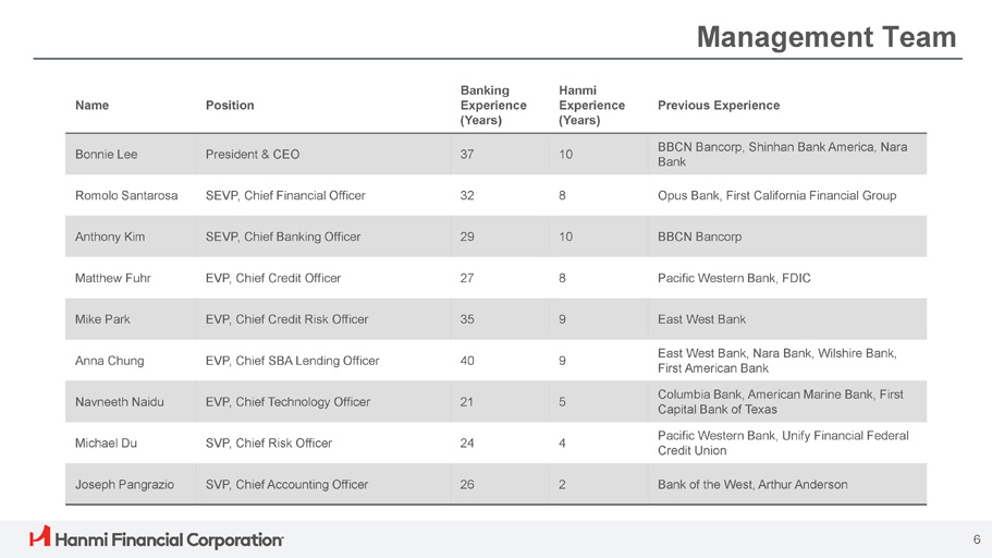 Previous Experience Hanmi Experience (Years) Banking Experience (Years) Position Name BBCN Bancorp, Shinhan Bank America, Nara Bank 10 37 President & CEO Bonnie Lee Opus Bank, First California Financial Group 8 32 SEVP, Chief Financial Officer Romolo Santarosa BBCN Bancorp 10 29 SEVP, Chief Banking Officer Anthony Kim Pacific Western Bank, FDIC 8 27 EVP, Chief Credit Officer Matthew Fuhr East West Bank 9 35 EVP, Chief Credit Risk Officer Mike Park East West Bank, Nara Bank, Wilshire Bank, First American Bank 9 40 EVP, Chief SBA Lending Officer Anna Chung Columbia Bank, American Marine Bank, First Capital Bank of Texas 5 21 EVP, Chief Technology Officer Navneeth Naidu Pacific Western Bank, Unify Financial Federal Credit Union 4 24 SVP, Chief Risk Officer Michael Du Bank of the West, Arthur Anderson 2 26 SVP, Chief Accounting Officer Joseph Pangrazio 6 Management Team