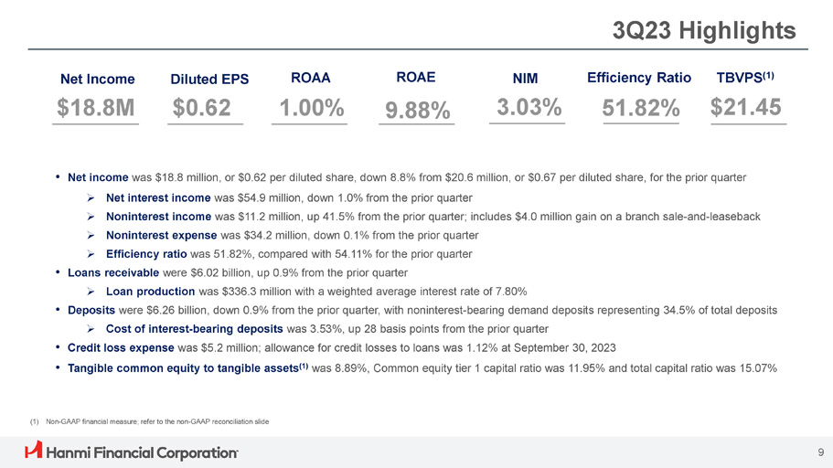Why Hanmi? • Strong average loan growth reflecting an 11% CAGR since 2013 • Significant progress reducing CRE concentration from 85% of the total portfolio, at December 31, 2013 to 63%, at September 30, 2023, through portfolio diversification that includes equipment finance, RRE, and multi - family • Allowance for credit losses to loans was 1.12% at September 30, 2023 and nonperforming assets were 0.22% of total assets • Strong average deposit growth reflecting a 10% CAGR since 2013 • Average noninterest - bearing deposit at $2.2 billion, represents 36% of average deposits at September 30, 2023 year - to - date, and reflects a 12% CAGR since 2013 • Business deposits represent 52% of total deposits at September 30, 2023 Premier Deposit Franchise Diversified Loan Portfolio and Disciplined Credit Administration 8 Strong Culture and Commitment to ESG (2) Prudent Capital Management • Cash dividend of $0.25 per share, demonstrating management’s confidence in the Company’s performance • Tangible common equity to tangible assets (1) was 8.89% at the end of the third quarter. Common equity tier 1 capital ratio was 11.95% and total capital ratio was 15.07% • Bank remains well - capitalized and Company exceeds minimum capital requirements at September 30, 2023 • Hanmi Financial Corporation received highest ISS ESG designation in Governance in 2022 (2) • $7.5 million long - term commitment to a Community Reinvestment Act fund (2) • 426 Hanmi Bank Dream Scholarships awarded to support at - risk youth program (2) (1) Non - GAAP financial measure; refer to the non - GAAP reconciliation slide (2) Based on the 2023 Hanmi ESG Report (published on April 2023)