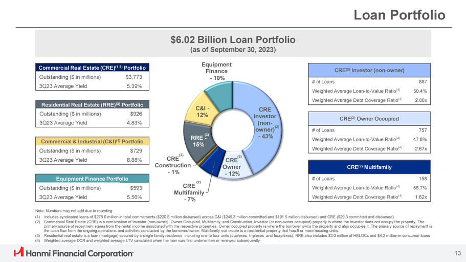 Successful Portfolio Diversification Strategy 12 Loan Composition (as of September 30, 2023) Loan Composition (as of December 31, 2013) $2.23 Billion $6.02 Billion (1) RRE includes Consumer loans (2) $144.5 million or 7.6% and $113.9 million or 3.0% of the CRE portfolio is unguaranteed SBA loans at December 31, 2013 and September 30, 2023, respectively (3) $7.0 million or 3.1% and $50.0 million or 6.9% of the C&I portfolio is unguaranteed SBA loans at December 31, 2013 and September 30, 2023, respectively CRE – 63% Equipment Finance – 10% (1) RRE – 5% (1) RRE – 15% Significant progress reducing CRE concentration from 85% of total portfolio to 63%. (2) C& I ( 3 – ) 12% (2) CRE – 85% (3) C&I – 10%