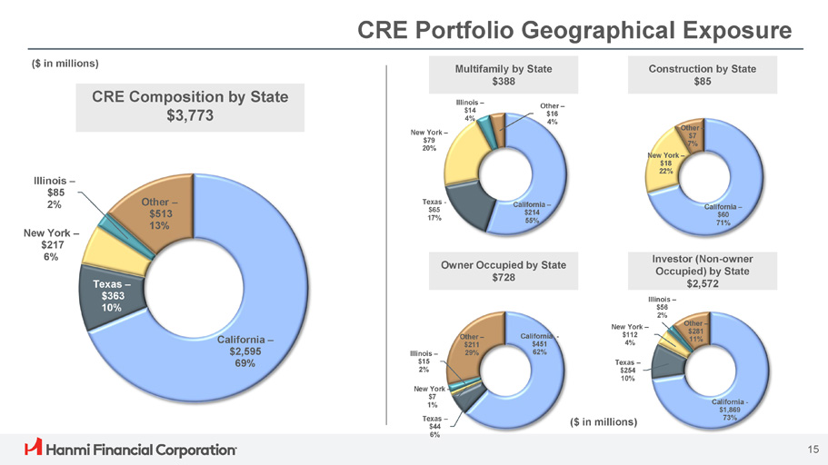 Loan Portfolio Diversification Loan portfolio is well diversified across collateral types and industry types; CRE represents 63% of the total portfolio and C&I represents 12%. CRE Portfolio (1) $3.77B C&I Portfolio (2) $729M Retail – 29% Hospitality – 19% Office – 15% Industrial – 10% Multifamily – 10% Construction 2% Mixed Use – 3% Gas Station – 6% Other – 6% Manufacturing - 26% 14 Finance & Insurance - 14% Wholesale Trade - 6% Retail Trade - 8% Real Estate Rental & Leasing - 5% Healthcare - 8% Other - 33% (1) $113.6 million, or 3.0%, of the CRE portfolio are unguaranteed SBA loans (2) $50 million, or 6.9%, of the C&I portfolio are unguaranteed SBA loans