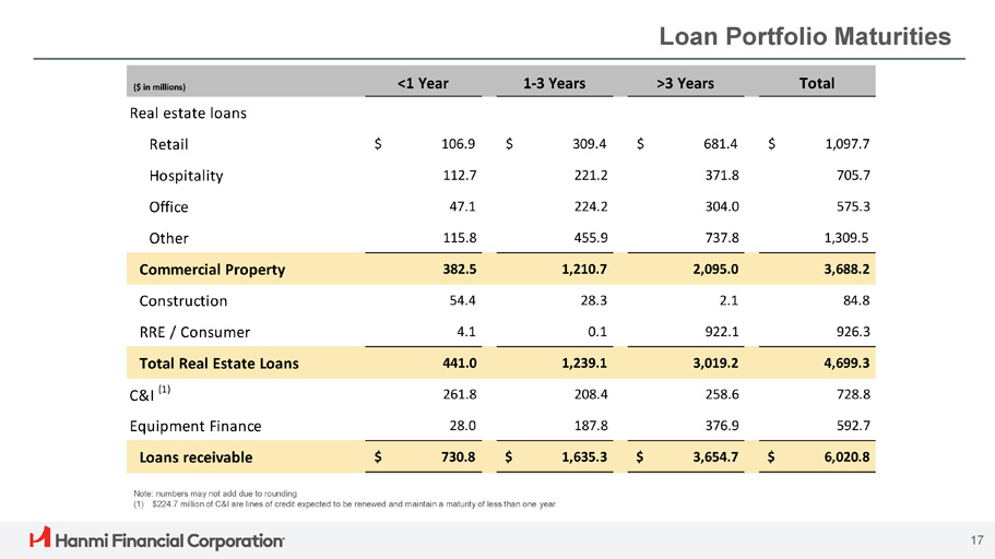 Loan Portfolio Distribution CRE C&I ($ in millions) ($ in millions) (1) Construction Multifamily Non - owner Occupied Owner Occupied $85 $388 $2,572 $728 Total Balance $9.42 $2.46 $2.90 $0.96 Average $2.09 $1.00 $1.13 $0.31 Median $56 $275 $1,834 $544 (3) Top Quintile Balance $25.7 or more $2.4 or more $3.5 or more $1.1 or more Top Quintile Loan Size $27.90 $8.59 $10.42 $3.62 Top Quintile Average $27.90 $4.27 $6.69 $2.00 Top Quintile Median Lines of Credit (2) Term (2) $354 $375 Total Balance $0.64 $0.38 Average $0.05 $0.05 Median $304 $337 Top Quintile Balance (3) $0.7 or more $0.1 or more Top Quintile Loan Size $4.06 $1.76 Top Quintile Average $1.48 $0.23 Top Quintile Median Residential Real Estate & Equipment Finance 16 Equipment Finance Residential Real Estate $593 $926 Total Balance $0.05 $0.53 Average $0.03 $0.46 Median $299 $380 Top Quintile Balance (3) $0.1 or more $0.7 or more Top Quintile Loan Size $0.12 $1.10 Top Quintile Average $0.10 $0.92 Top Quintile Median ($ in millions) (1) Represents the total outstanding amount. Advances require authorization and disbursement requests, depending on the progress of the project and inspections. Advances are non - revolving and are made throughout the term, up to the original commitment amount (2) Term loans are commitment for a specified term. Majority of the Lines of Credit are revolving, including commercial revolvers, with some non - revolvers (sub - notes and working capital tranches) (3) Top quintile represents top 20% of the loans
