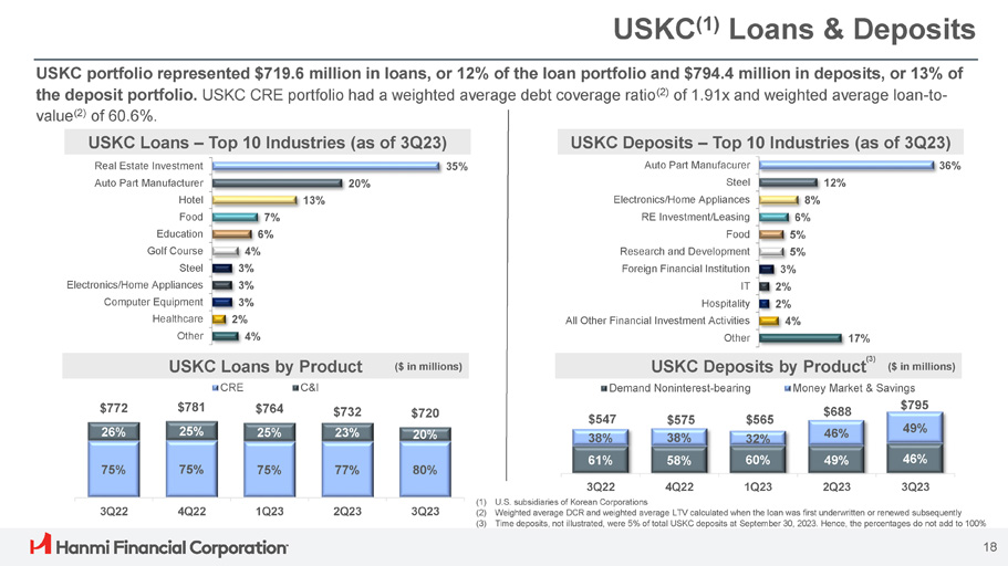 Total >3 Years 1 - 3 Years <1 Year ($ in millions) $ 1,097.7 $ 681.4 $ 309.4 $ 106.9 Real estate loans Retail 705.7 371.8 221.2 112.7 Hospitality 575.3 304.0 224.2 47.1 Office 1,309.5 737.8 455.9 115.8 Other 3,688.2 2,095.0 1,210.7 382.5 Commercial Property 84.8 2.1 28.3 54.4 Construction 926.3 922.1 0.1 4.1 RRE / Consumer 4,699.3 3,019.2 1,239.1 441.0 Total Real Estate Loans 728.8 258.6 208.4 261.8 C&I (1) 592.7 376.9 187.8 28.0 Equipment Finance $ 6,020.8 $ 3,654.7 $ 1,635.3 $ 730.8 Loans receivable Loan Portfolio Maturities 17 Note: numbers may not add due to rounding (1) $224.7 million of C&I are lines of credit expected to be renewed and maintain a maturity of less than one year