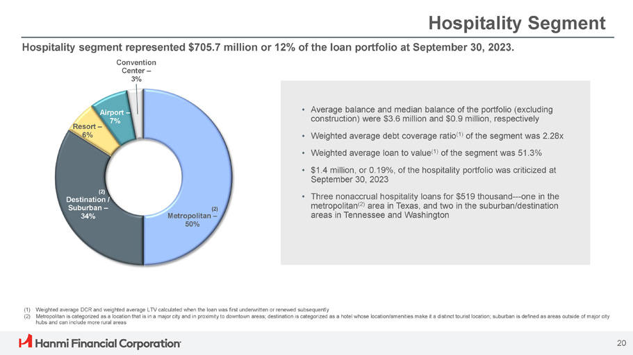 Resort – 6% 20 Airport – 7% (2) Metropolitan – 50% (2) Destination / Suburban – 34% Hospitality Segment Hospitality segment represented $705.7 million or 12% of the loan portfolio at September 30, 2023. Convention Center – 3% (1) Weighted average DCR and weighted average LTV calculated when the loan was first underwritten or renewed subsequently (2) Metropolitan is categorized as a location that is in a major city and in proximity to downtown areas; destination is categorized as a hotel whose location/amenities make it a distinct tourist location; suburban is defined as areas outside of major city hubs and can include more rural areas • Average balance and median balance of the portfolio (excluding construction) were $ 3 . 6 million and $ 0 . 9 million, respectively • Weighted average debt coverage ratio (1) of the segment was 2.28x • Weighted average loan to value (1) of the segment was 51.3% • $ 1 . 4 million, or 0 . 19 % , of the hospitality portfolio was criticized at September 30 , 2023 • Three nonaccrual hospitality loans for $ 519 thousand --- one in the metropolitan ( 2 ) area in Texas, and two in the suburban/destination areas in Tennessee and Washington