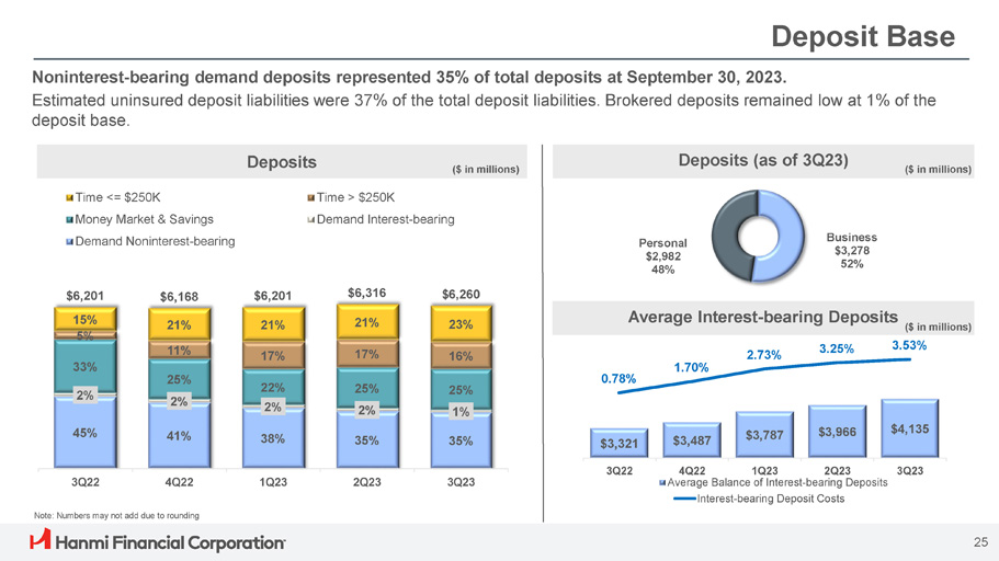 31% 31% 30% 33% 30% 29% 27% 34% 41% 45% 36% 69% 69% 70% 67% 70% 71% 73% 66% 59% 55% 64% $2,391 $2,872 $3,503 $3,608 $4,160 $4,461 $4,691 $5,560 $4,946 $5,950 $6,188 2013 2014 2015 2021 2022 2023 YTD 2016 2017 2018 Noninterest - bearing deposits 2019 2020 Interest - bearing deposits ($ in millions) Strong deposit growth reflecting a 10% CAGR since 2013. Average noninterest - bearing deposits have grown by 12% CAGR since 2013, and now represents 36% of total deposits. 24 Average Deposit Trend