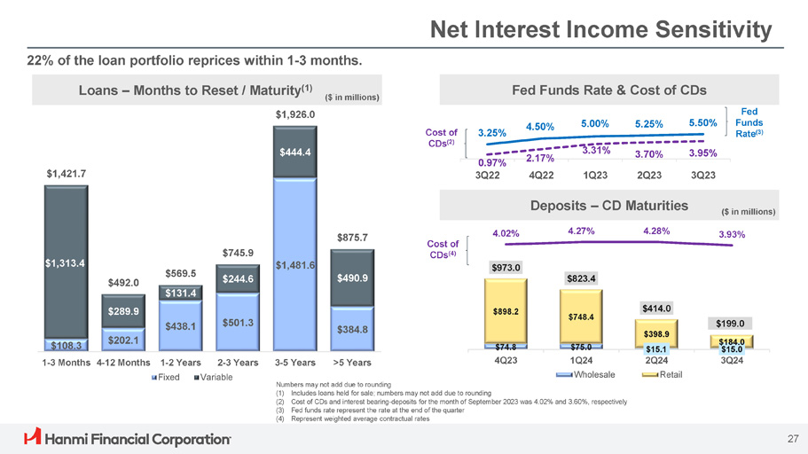 0.78% 1.70% 2.73% 3.25% 3.53% 4Q22 1Q23 2Q23 Average Balance of Interest - bearing Deposits Interest - bearing Deposit Costs $3,321 $3,487 $3,787 $3,966 $4,135 3Q22 3Q23 Deposit Base Noninterest - bearing demand deposits represented 35% of total deposits at September 30, 2023. Estimated uninsured deposit liabilities were 37% of the total deposit liabilities. Brokered deposits remained low at 1% of the deposit base. Note: Numbers may not add due to rounding Deposits ($ in millions) Deposits (as of 3Q23) Average Interest - bearing Deposits ($ in millions) Business $3,278 52% Personal $2,982 48% ($ in millions) 45% 41% 38% 35% 35% 2% 2% 2% 2% 1% 33% 25% 22% 25% 25% 17% 17% 16% 21% 11% 21% 21% 23% $6,201 15% 5% $6,168 $6,201 $6,316 $6,260 3Q22 4Q22 1Q23 2Q23 3Q23 Time <= $250K Money Market & Savings Demand Noninterest - bearing Time > $250K Demand Interest - bearing 25