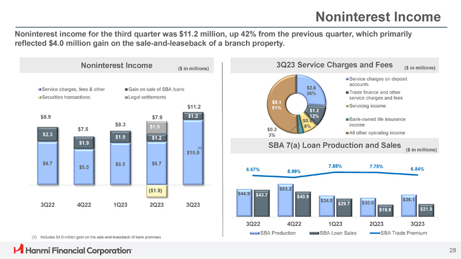$2.6 26% $1.2 12% $0.8 8% $0.3 3% $5.1 51% Service charges on deposit accounts Trade finance and other service charges and fees Servicing income Bank - owned life insurance income All other operating income Noninterest Income SBA 7(a) Loan Production and Sales ($ in millions) $44.9 $53.2 $34.5 $30.9 $36.1 $43.7 $40.9 $29.7 $19.9 $21.0 6.67% 5.99% 7.85% 7.75% 6.84% 3Q22 4Q22 1Q23 SBA Loan Sales SBA Production 2Q23 3Q23 SBA Trade Premium Noninterest income for the third quarter was $11.2 million, up 42% from the previous quarter, which primarily reflected $4.0 million gain on the sale - and - leaseback of a branch property. Noninterest Income 3Q23 Service Charges and Fees ($ in millions) ($ in millions) $6.7 $5.5 $6.5 $6.7 $2.3 $1.9 $1.9 $1.2 $8.9 $7.5 $8.3 $11.2 $1.2 3Q22 4Q22 1Q23 2Q23 3Q23 Service charges, fees & other Securities transactions Gain on sale of SBA loans Legal settlements Total noninterest income ($1.9) 28 $7.9 $1.9 (1) $10.0 (1) Includes $4.0 million gain on the sale - and - leaseback of bank premises