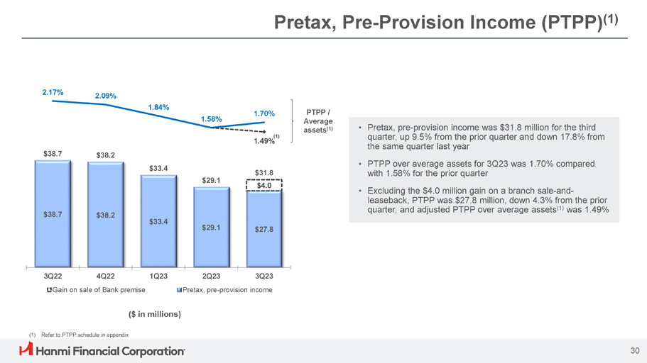 Pretax, Pre - Provision Income (PTPP) (1) $29.1 $27.8 2.17% 2.09% 1Q23 3Q22 4Q22 Gain on sale of Bank premise 2Q23 3Q23 Pretax, pre - provision income Average 30 Pretax, pre - provision income was $31.8 million for the third quarter, up 9.5% from the prior quarter and down 17.8% from the same quarter last year • PTPP / assets (1) 1.70% (1) 1.49% 1.58% 1.84% $38.2 $38.7 PTPP over average assets for 3Q23 was 1.70% compared with 1.58% for the prior quarter Excluding the $4.0 million gain on a branch sale - and - • • $31.8 $4.0 $29.1 $33.4 leaseback, PTPP was $27.8 million, down 4.3% from the prior quarter, and adjusted PTPP over average assets (1) was 1.49% $33.4 $38.2 $38.7 ($ in millions) (1) Refer to PTPP schedule in appendix
