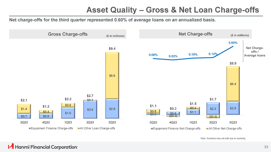 $11.6 $9.8 $20.1 $22.2 $15.8 $0.8 $0.1 $0.1 $0.1 $0.1 $12.4 $10.0 $20.2 $22.3 $15.9 2Q23 3Q23 3Q22 4Q22 1Q23 Nonperforming loans Note: Numbers may not add due to rounding OREO Asset Quality – Nonperforming Assets & Nonaccrual Loans 0.17% 0.14% 0.27% 0.30% 0.22% Nonperforming assets / Total assets Nonperforming Assets (1) Nonaccrual Loans Nonperforming assets were $15.9 million at the end of the third quarter, down from $22.3 million at the end of the second quarter, primarily due to $6.1 million of charge - offs on $11.0 million of previously identified classified loans. ($ in millions) ($ in millions) (1) Nonperforming assets exclude repossessed personal property of $0.2 million, $0.5 million, $0.6 million, $0.8 million, and $1.3 million for September 30, 2022, December 31, 2022, March 31, 2023, June 30, 2023, and September 30, 2023, respectively (2) Specific allowance for credit losses at September 30, 2022, December 31, 2022, March 31, 2023, June 30, 2023, and September 30, 2023 was $2.2 million, $3.3 million, $6.2 million, $7.4 million, and $2.9 million, respectively (3) RRE includes consumer loans $5.5 $5.7 $6.7 $6.9 $7.9 $0.9 $5.2 $3.6 $0.5 $2.9 $0.5 $5.3 $3.0 $10.0 $4.9 $11.6 (2) (2) $22.2 1Q23 2Q23 (3) (2) $9.8 (2) $15.8 (2) $20.1 3Q23 RRE 3Q22 4Q22 Equipment Finance All other CRE and C&I < $3M All other CRE and C&I >= $3M 32 $10.0