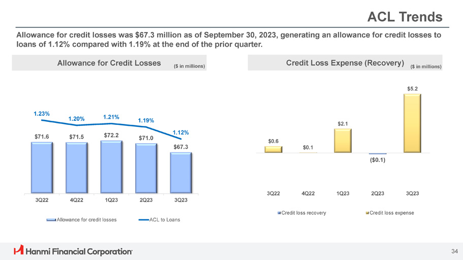 Asset Quality – Gross & Net Loan Charge - offs Gross Charge - offs Net Charge - offs Net Charge - offs / Average loans Net charge - offs for the third quarter represented 0.60% of average loans on an annualized basis. ($ in millions) ($ in millions) $1.6 $2.6 $2.8 $1.4 $0.6 $6.6 $2.1 $1.2 $0.4 $2.2 $2.7 $0.1 $9.4 Equipment Finance Charge - offs All Other Loan Charge - offs Note: Numbers may not add due to rounding $2.3 $2.5 $6.4 $1.1 $0.8 $0.3 $0.3 $0.6 $1.5 $0.4 $1.1 $1.7 ($0.6) ($0.3) $0.8 $0.7 3Q23 2Q23 1Q23 4Q22 3Q22 3Q23 2Q23 1Q23 4Q22 3Q22 $8.9 0.08% 0.02% 0.10% 0.12% 0.60% Equipment Finance Net Charge - offs All Other Net Charge - offs 33